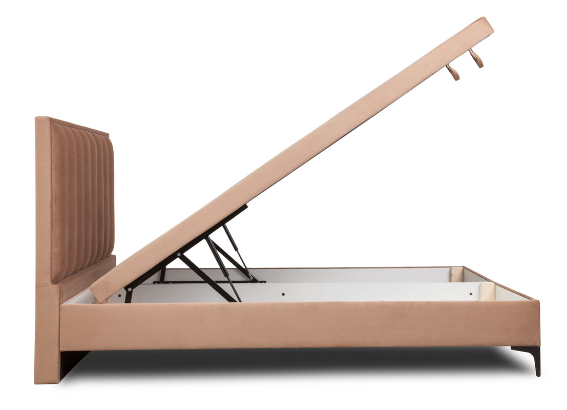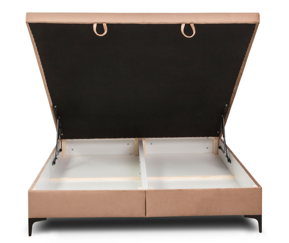 Jedną z kluczowych cech tego łóżka jest wbudowany pojemnik na pościel, umieszczony pod stelażem drewnianym. Dzięki niemu, utrzymanie porządku w sypialni staje się łatwe, a dodatkowe koce, poduszki czy pościel zawsze są pod ręką, jednocześnie pozostając schowane przed wzrokiem. Stelaż drewniany, tapicerowany elegancką tkaniną Bluvel 28 w beżowym kolorze, nadaje łóżku niepowtarzalny charakter.