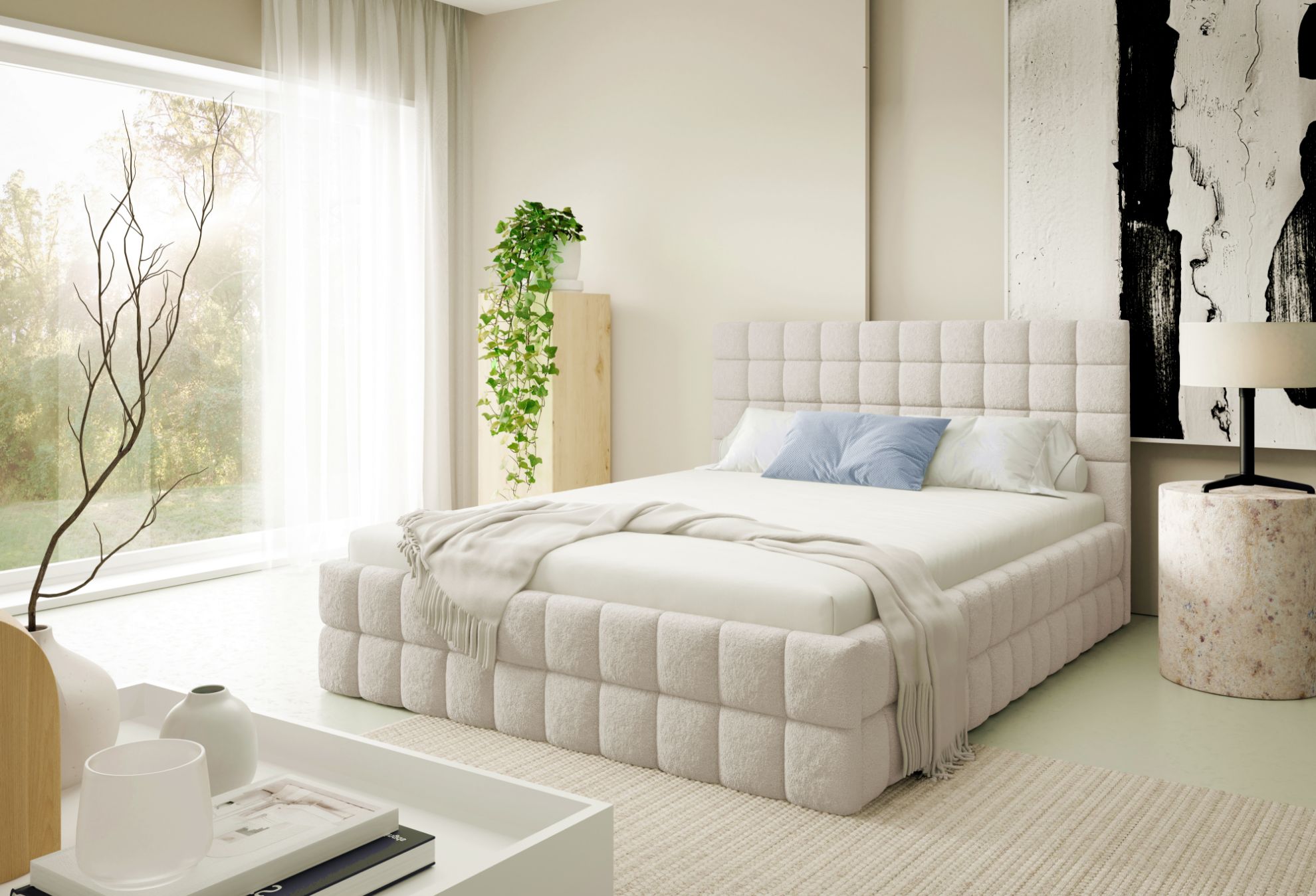 Łóżko tapicerowane Dopio 140x200 w tkaninie LAMBI 05 w beżowym kolorze to stylowa i komfortowa propozycja do sypialni. Miękka tapicerka Lambi 05 w ciepłym beżowym odcieniu nadaje wnętrzu przytulny, spokojny i elegancki charakter, doskonale wpisując się w nowoczesne i klasyczne aranżacje sypialni.