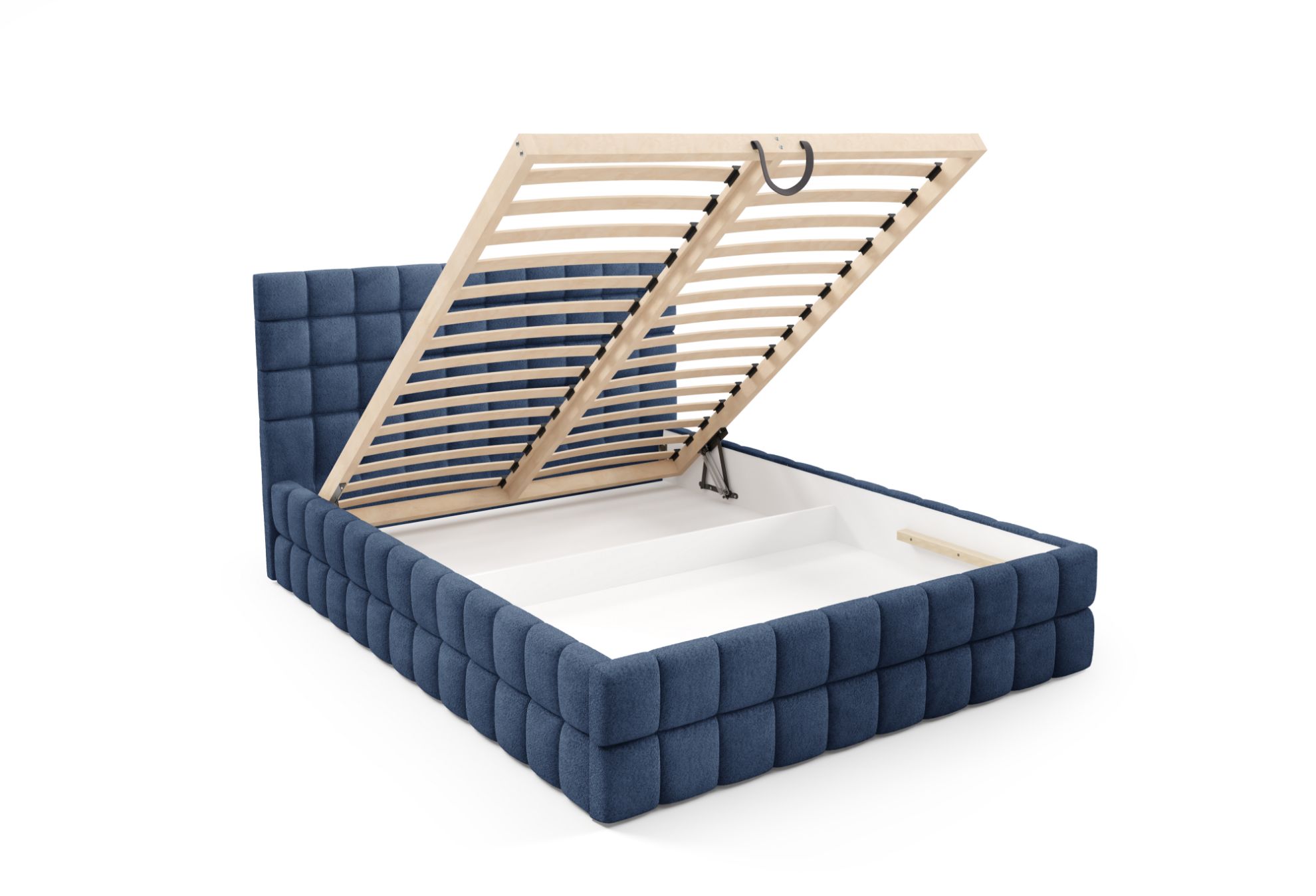 Model Dopio wyróżnia się solidnym drewnianym stelażem z 32 listwami sprężynującymi, który zapewnia stabilne podparcie materaca. Mechanizm automatyczny na sprężynach ułatwia otwieranie pojemnika na pościel, pozwalając w prosty sposób przechowywać kołdry, poduszki i inne tekstylia.