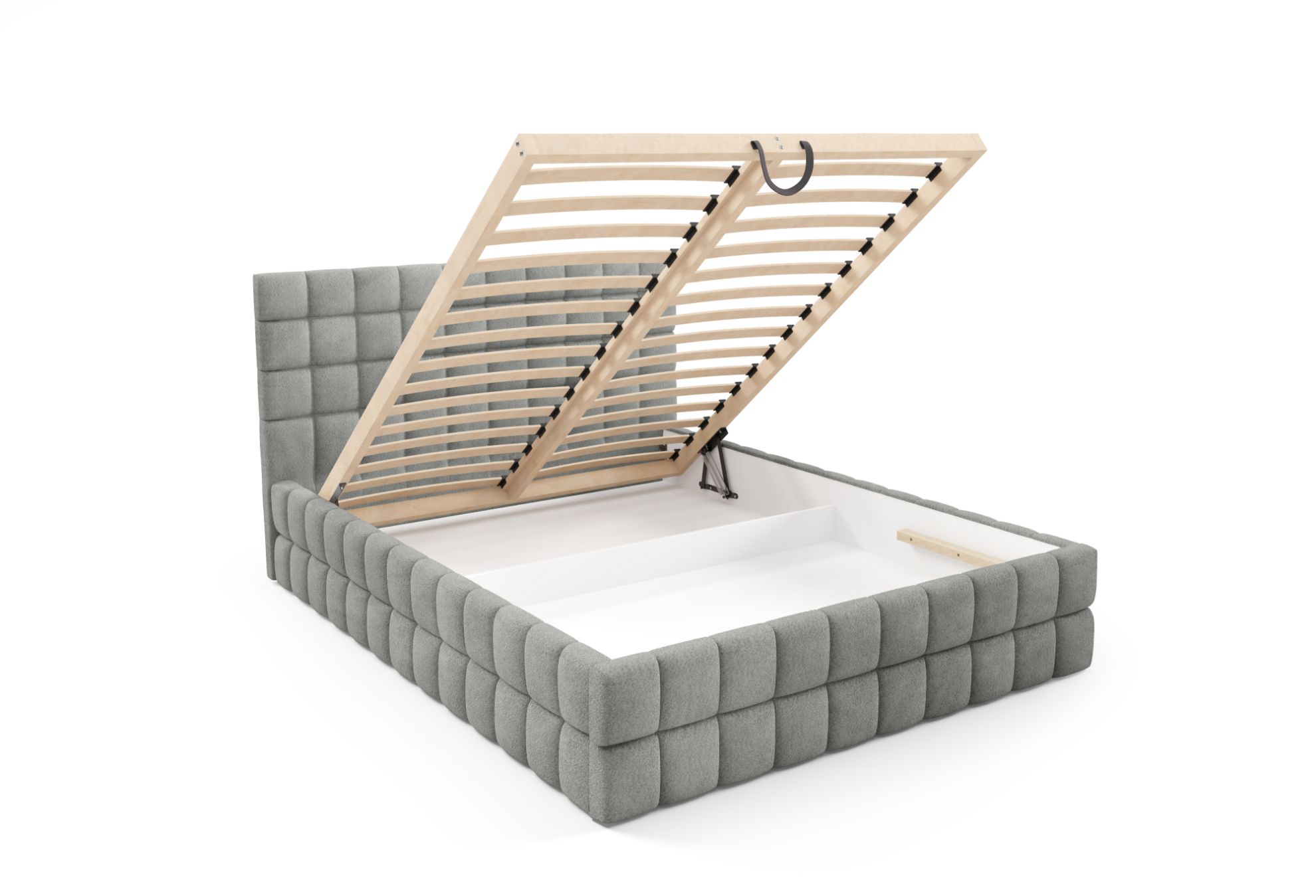 Model Dopio wyróżnia się solidnym drewnianym stelażem z 32 listwami sprężynującymi, który zapewnia stabilne podparcie materaca. Mechanizm automatyczny na sprężynach ułatwia otwieranie pojemnika na pościel, umożliwiając wygodne przechowywanie kołder, poduszek i innych tekstyliów.