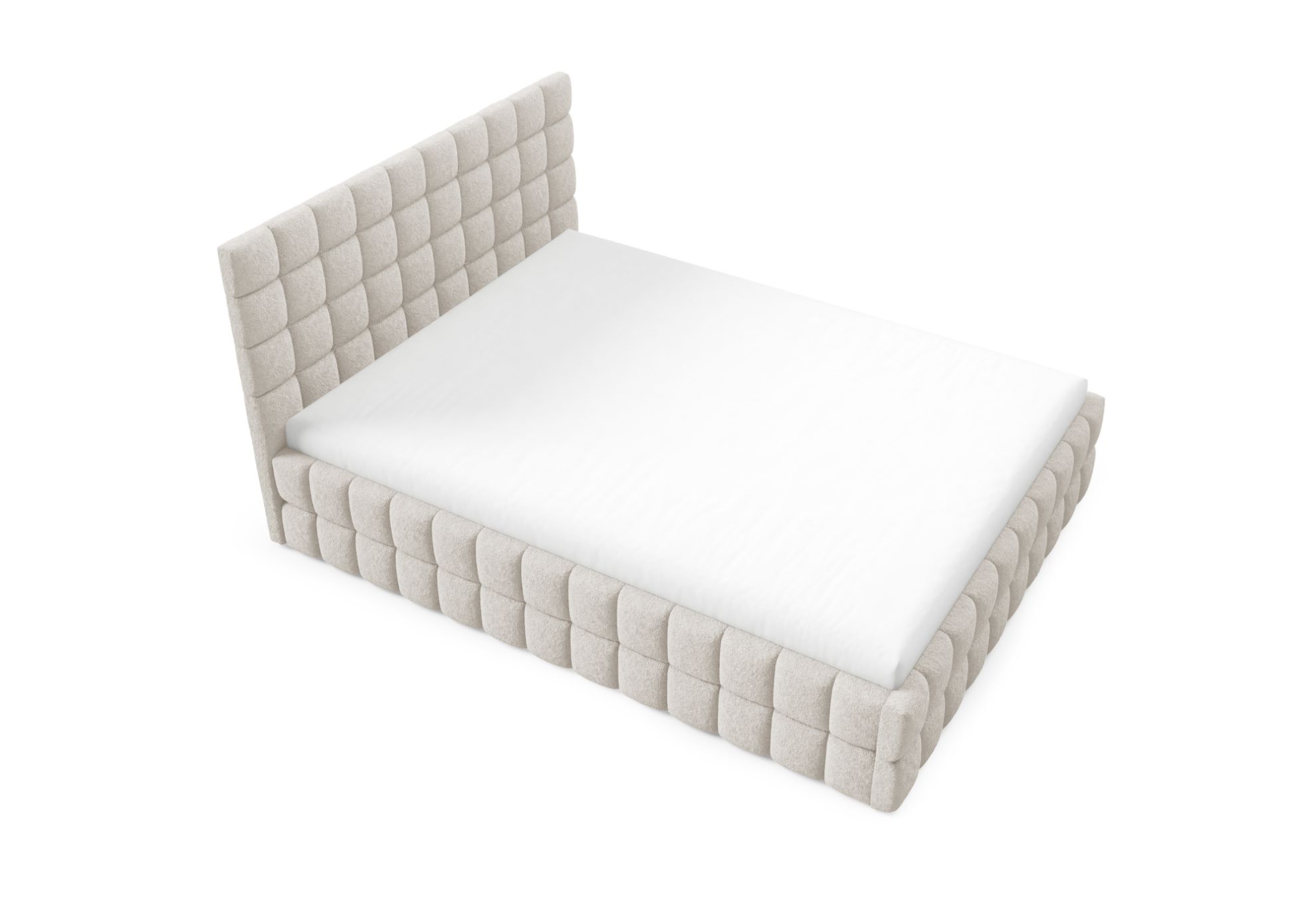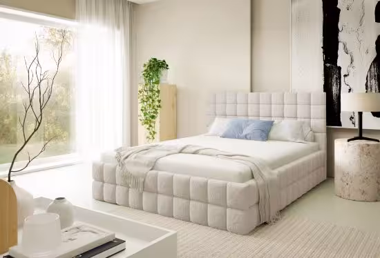 Łóżko nie posiada nóg, co podkreśla jego minimalistyczną, nowoczesną formę, a ozdobne przeszycia w tapicerce dodają całości elegancji i dopracowanego charakteru. To idealne połączenie komfortu, funkcjonalności i stylu, dzięki któremu sypialnia staje się miejscem spokojnym i przytulnym.