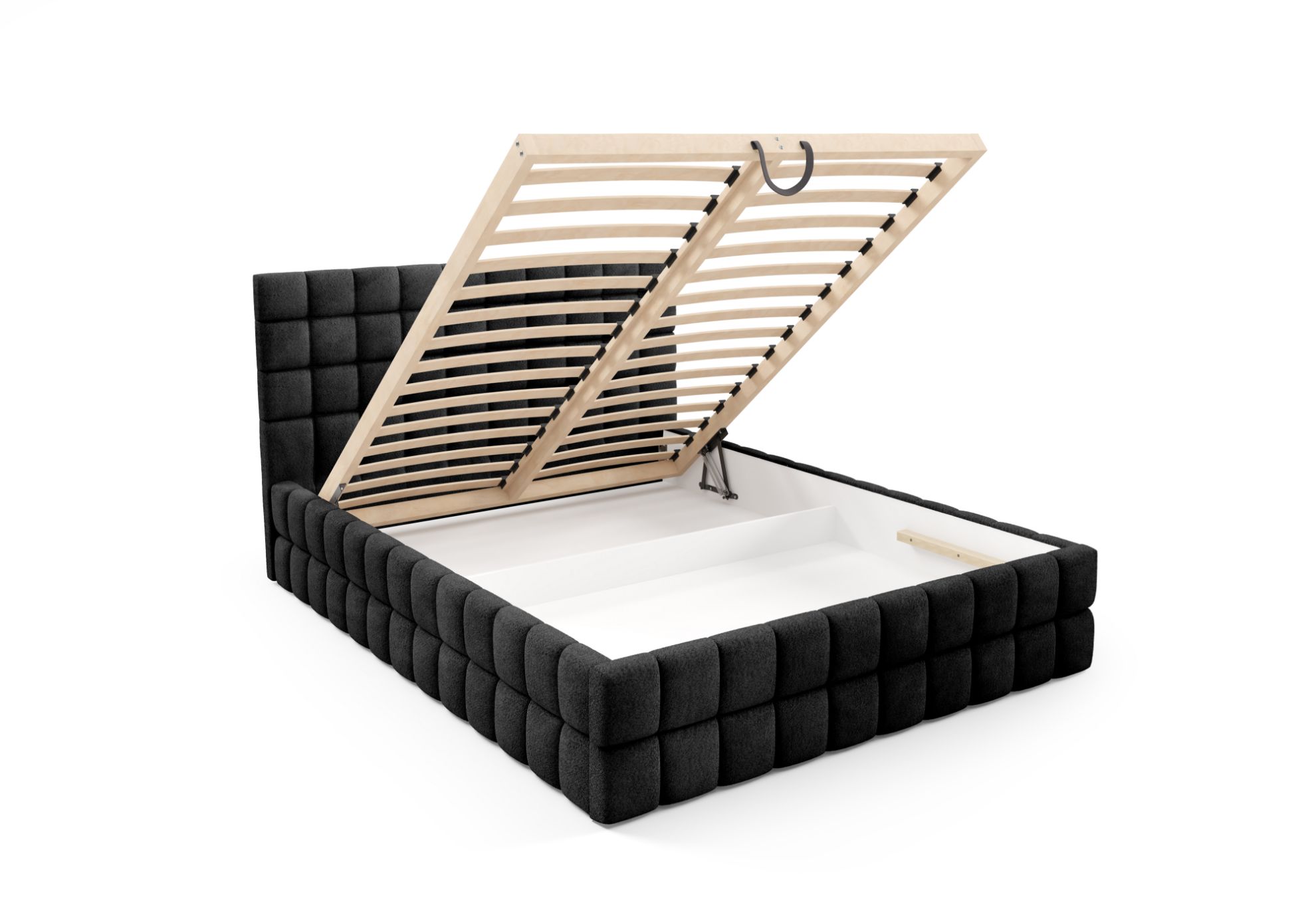 Model Dopio wyróżnia się solidnym drewnianym stelażem z 32 listwami sprężynującymi, który zapewnia stabilne podparcie materaca. Mechanizm automatyczny na sprężynach ułatwia otwieranie pojemnika na pościel, umożliwiając wygodne przechowywanie kołder, poduszek i innych tekstyliów.