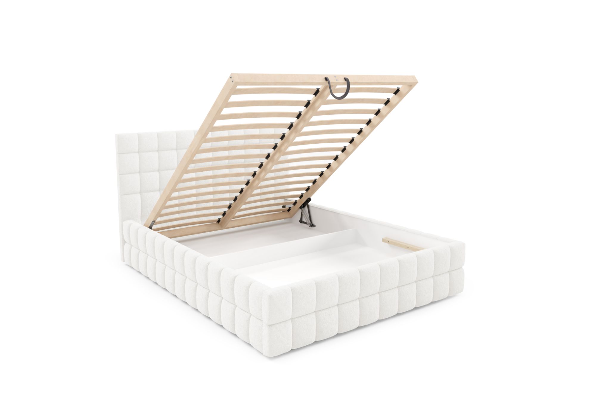 Model Dopio 180x200 został wyposażony w solidny drewniany stelaż z 32 listwami sprężynującymi, który zapewnia stabilne i wygodne podparcie materaca, zwiększając komfort codziennego użytkowania. Automatyczny mechanizm na sprężynach umożliwia łatwe otwieranie pojemnika na pościel, oferując praktyczną przestrzeń do przechowywania kołder, poduszek oraz innych tekstyliów.