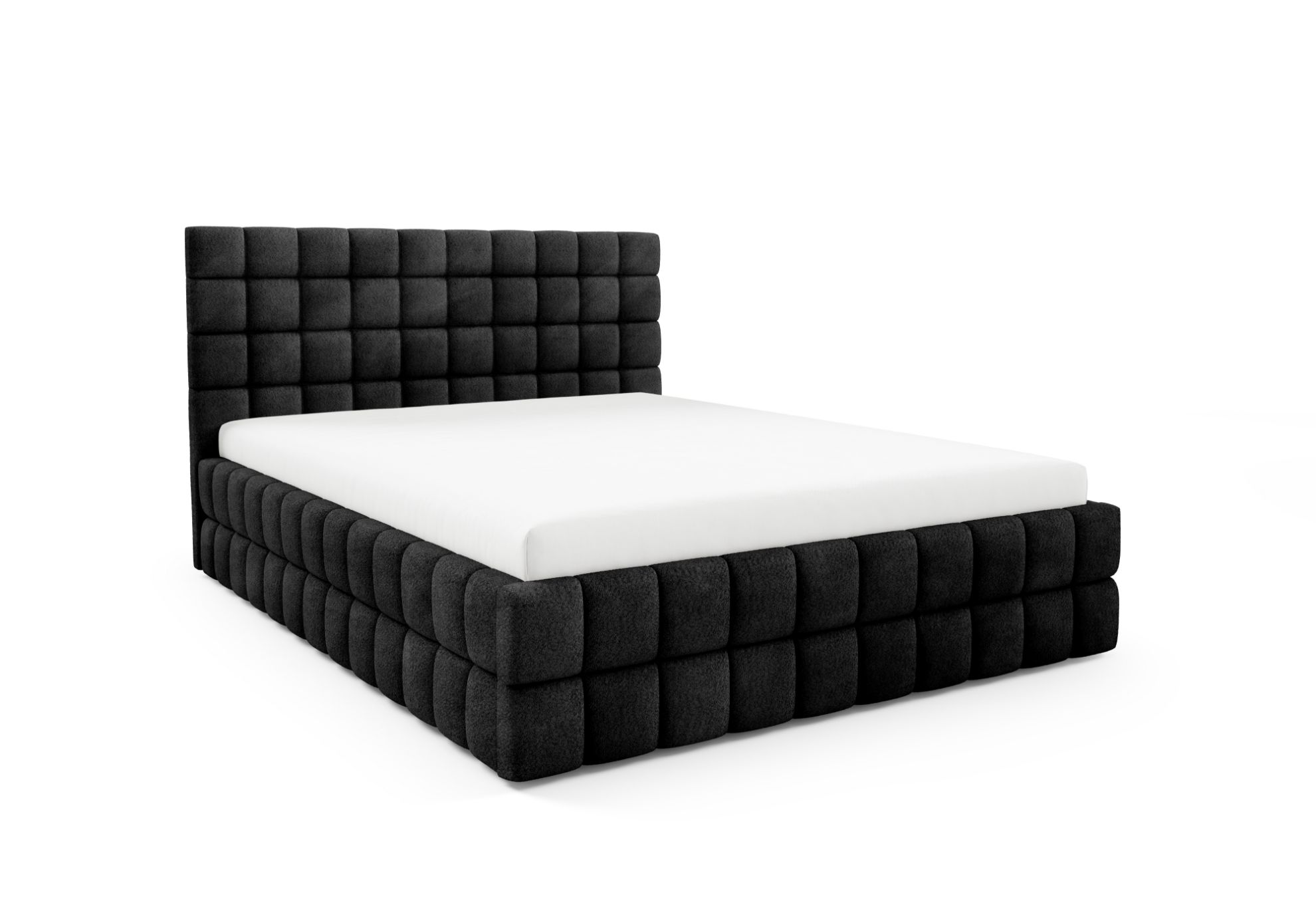 Łóżko nie posiada nóg, co podkreśla jego minimalistyczną, elegancką formę, a ozdobne przeszycia dodają całości stylowego i dopracowanego wyglądu. To harmonijne połączenie funkcjonalności, komfortu i nowoczesnego designu, dzięki któremu sypialnia staje się wygodnym i estetycznym miejscem wypoczynku.