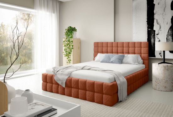 Łóżko tapicerowane Dopio 180x200 w tkaninie Lambi 14 w pomarańczowym kolorze to wyrazista i komfortowa propozycja do sypialni. Miękka, przyjemna w dotyku tapicerka Lambi 14 w ciepłym, pomarańczowym odcieniu nadaje wnętrzu energetyczny i przytulny charakter, doskonale komponując się zarówno z jasnymi, jak i ciemniejszymi aranżacjami.