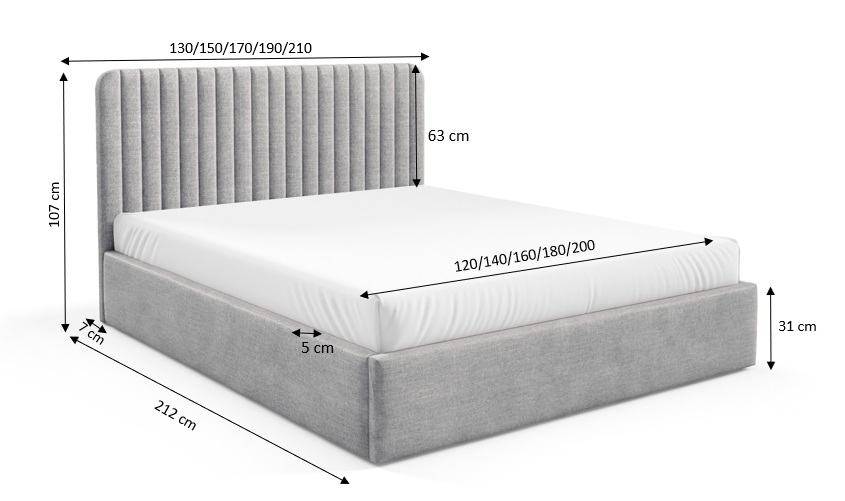 Łóżko zostało zaprojektowane bez nóżek i wyposażone w plastikowe ślizgi, co zapewnia stabilność oraz nowoczesny, minimalistyczny wygląd. To idealny wybór do nowoczesnych i klasycznych wnętrz, w których liczy się funkcjonalność i estetyka.
