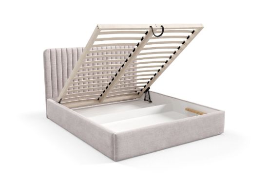 Model Dorni posiada w standardzie drewniany stelaż z 32 sprężynującymi listwami, które gwarantują doskonałe podparcie dla materaca i komfortowy sen. Dużym atutem jest pojemnik na pościel otwierany za pomocą automatu na sprężynach, co ułatwia codzienne użytkowanie i pozwala na praktyczne zagospodarowanie przestrzeni.