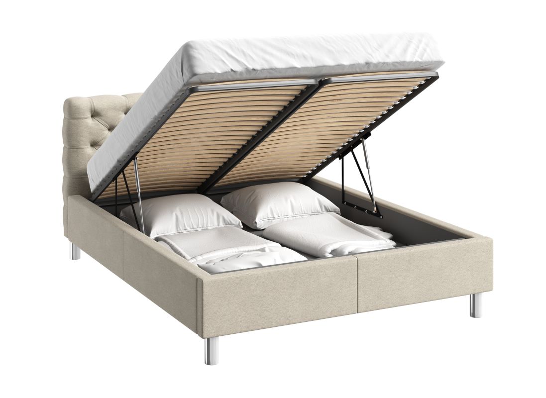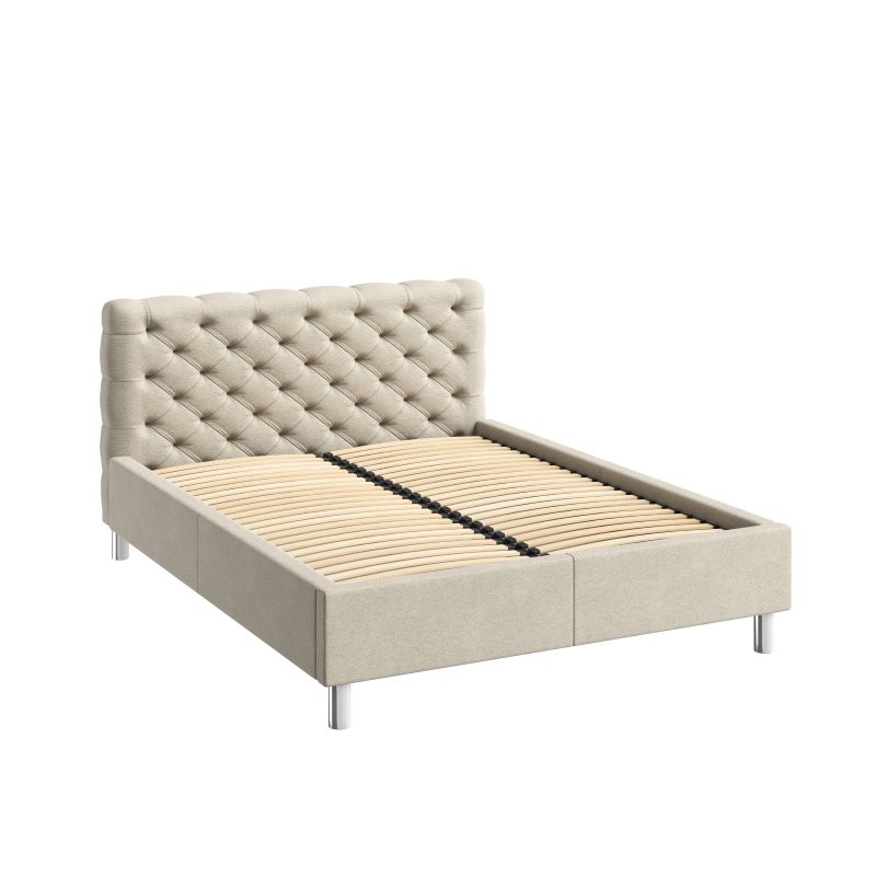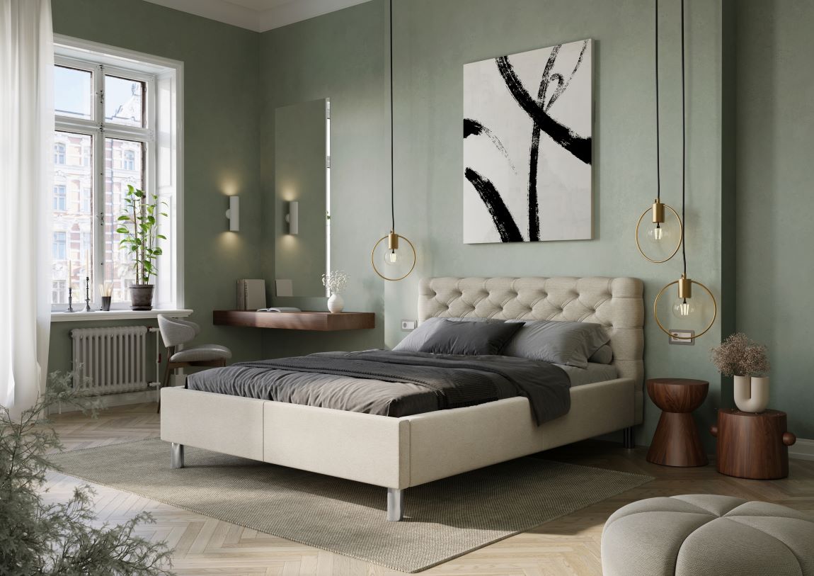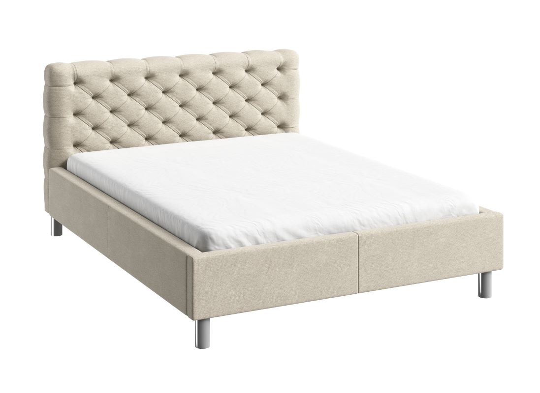 Rama łóżka oraz zagłówek zostały starannie tapicerowane wysokiej jakości tkaniną Primo w eleganckim, beżowym kolorze. Beżowa tonacja wprowadza do wnętrza ciepło i spokój, a jednocześnie jest na tyle uniwersalna, że doskonale komponuje się z różnorodnymi aranżacjami wnętrz. Pikowane wezgłowie, będące charakterystycznym elementem tego modelu, nie tylko dodaje szyku, ale również zapewnia komfortowe podparcie dla pleców podczas wieczornego relaksu z książką czy oglądania telewizji.
