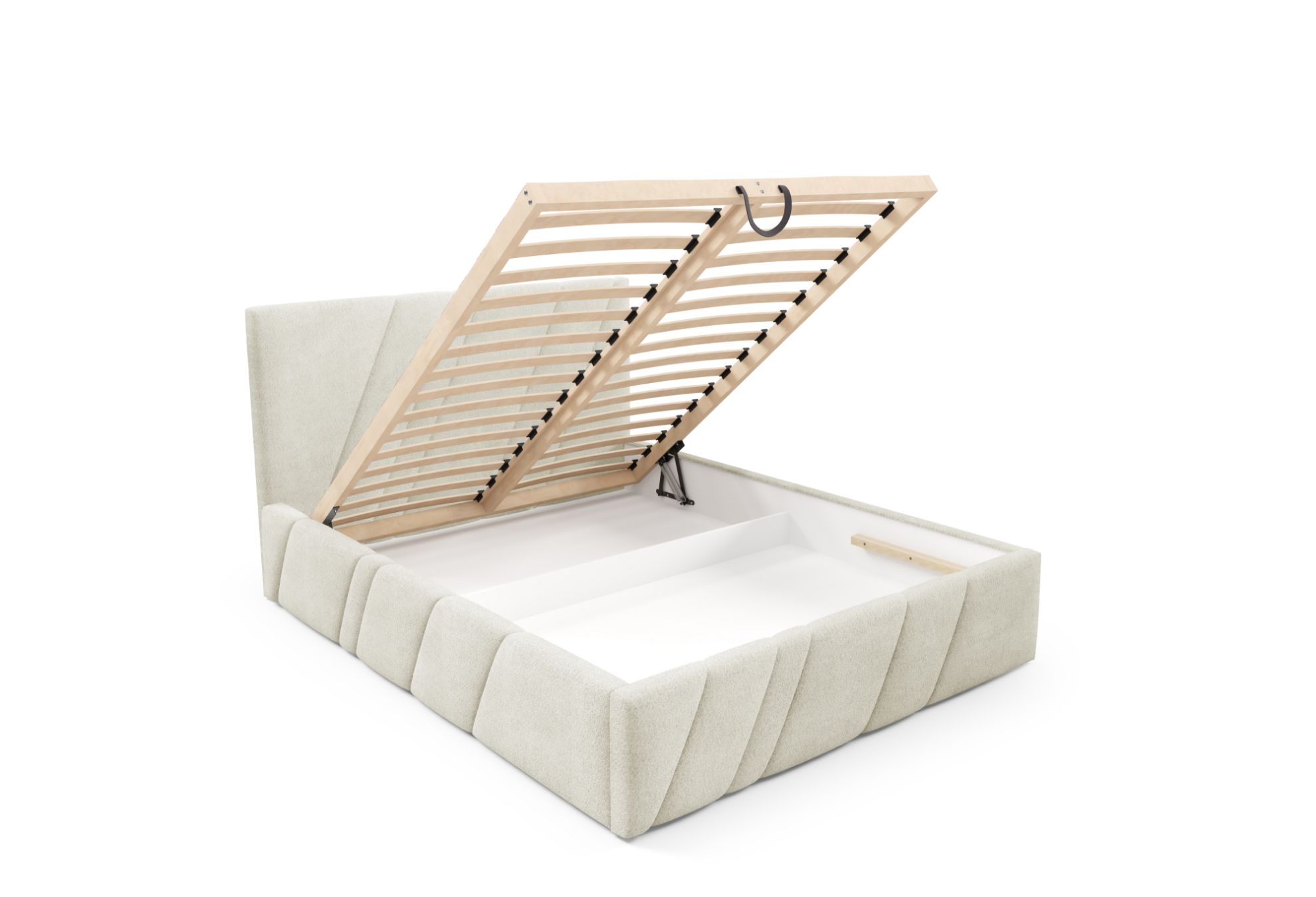 Model Kseno 140x200 został wyposażony w solidny drewniany stelaż w standardzie 32 z listwami sprężynującymi oraz automat na sprężynach ułatwiający otwieranie pojemnika, co zapewnia stabilne podparcie materaca oraz praktyczne wykorzystanie przestrzeni do przechowywania.