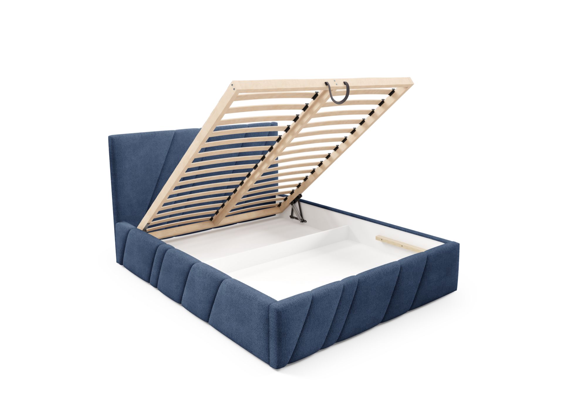 Model Kseno 160x200 został wyposażony w solidny drewniany stelaż w standardzie 32 z listwami sprężynującymi oraz automat na sprężynach ułatwiający otwieranie pojemnika, co zapewnia stabilne podparcie materaca oraz praktyczne wykorzystanie przestrzeni do przechowywania.