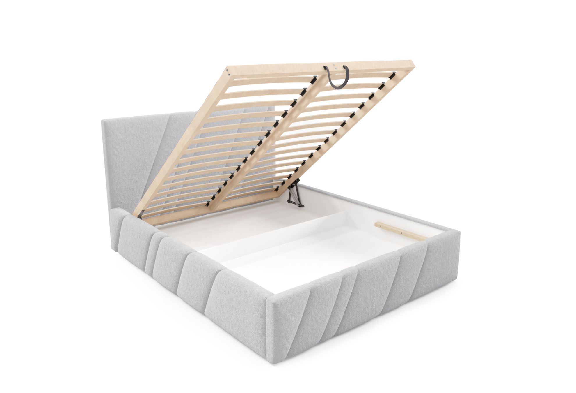 Model Kseno 160x200 został wyposażony w solidny drewniany stelaż w standardzie 32 z listwami sprężynującymi oraz automat na sprężynach ułatwiający otwieranie pojemnika, co zapewnia stabilne podparcie materaca oraz praktyczne wykorzystanie przestrzeni do przechowywania.