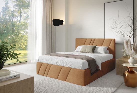 Łóżko tapicerowane Kseno 160x200 rudy w tkaninie Coral 35 to nowoczesna i elegancka propozycja do sypialni. Tapicerka Coral 35 w intensywnym rudym odcieniu wprowadza do wnętrza ciepło, charakter i harmonijny styl, doskonale komponując się zarówno z jasnymi, jak i kontrastowymi aranżacjami.