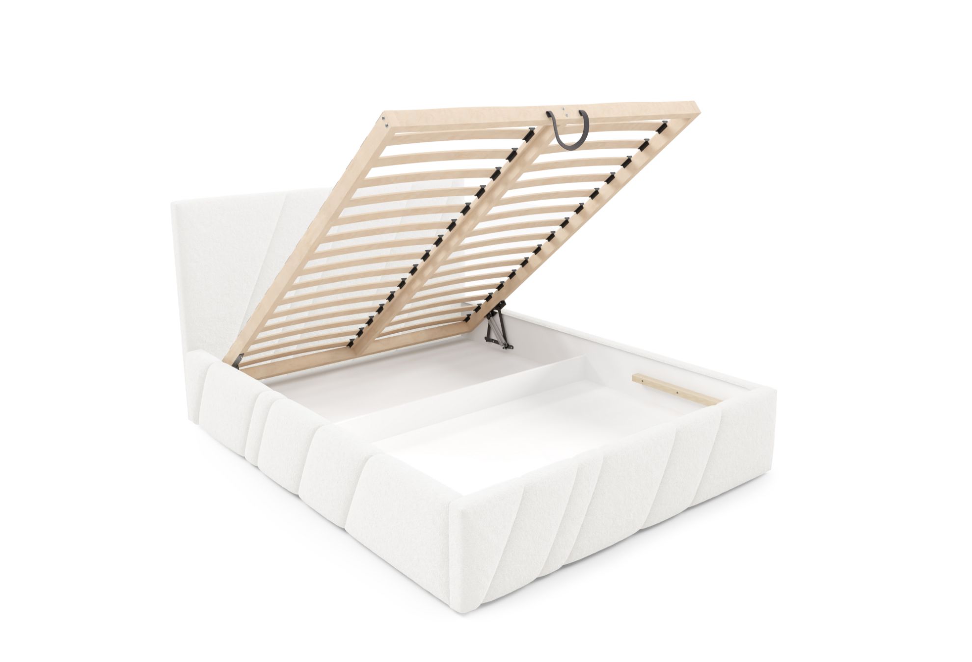 Model Kseno 180x200 został wyposażony w solidny drewniany stelaż w standardzie 32 z listwami sprężynującymi oraz automat na sprężynach ułatwiający otwieranie pojemnika, co zapewnia stabilne podparcie materaca oraz praktyczne wykorzystanie przestrzeni do przechowywania.