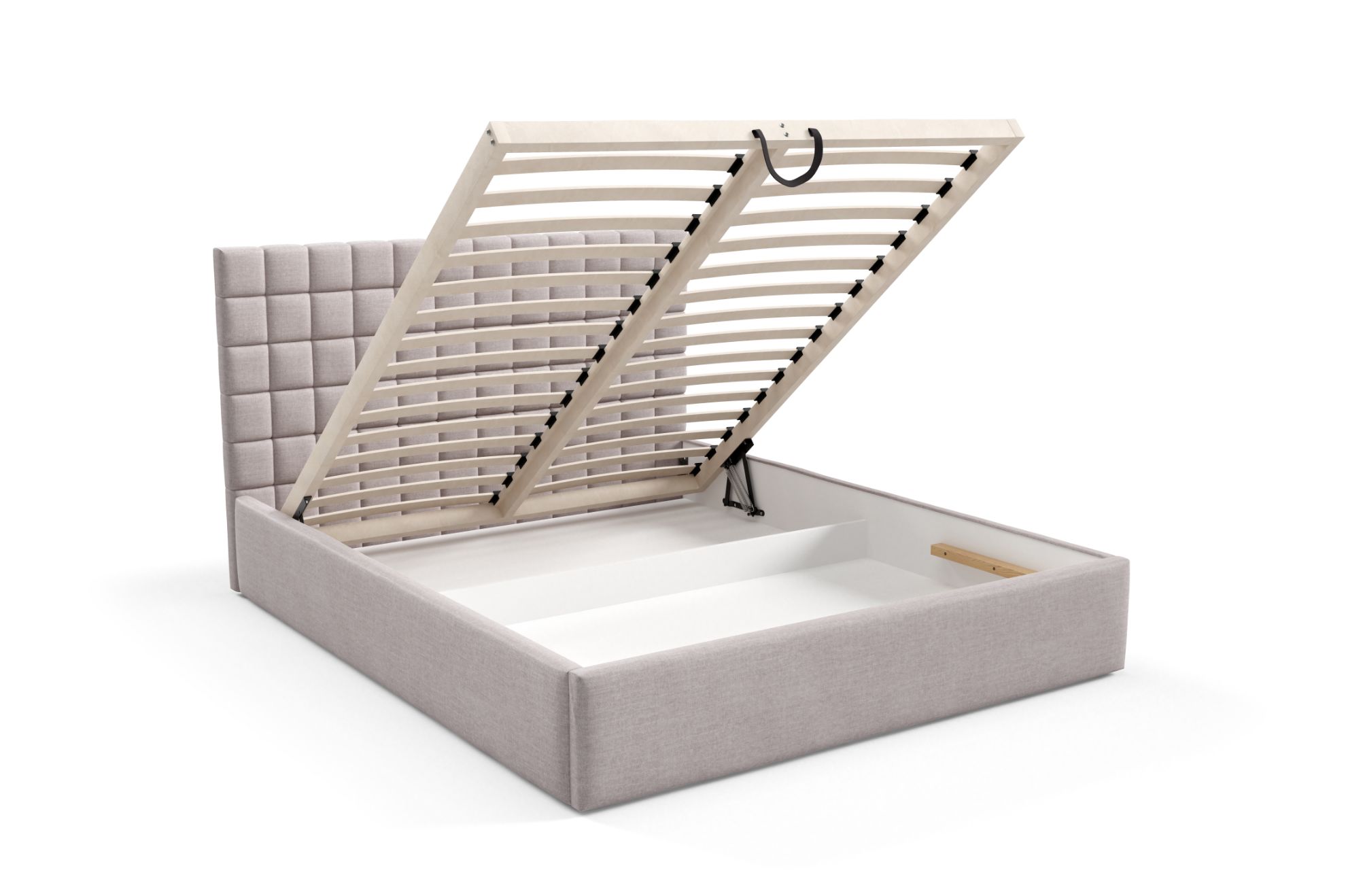 Model Lunara posiada w standardzie drewniany stelaż z 32 sprężynującymi listwami, które gwarantują doskonałe podparcie dla materaca i komfortowy sen. Dużym atutem jest pojemnik na pościel otwierany za pomocą automatu na sprężynach, co ułatwia codzienne użytkowanie i pozwala na praktyczne zagospodarowanie przestrzeni.