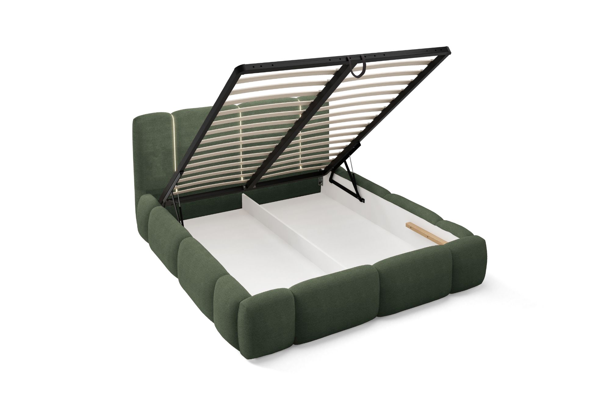 Model wyposażono w solidny metalowy stelaż z 34 listwami sprężynującymi, który zapewnia stabilne podparcie materaca. Siłowniki gazowe 1000N ułatwiają podnoszenie pojemnika na pościel, idealnego do przechowywania kołder, poduszek i innych tekstyliów.