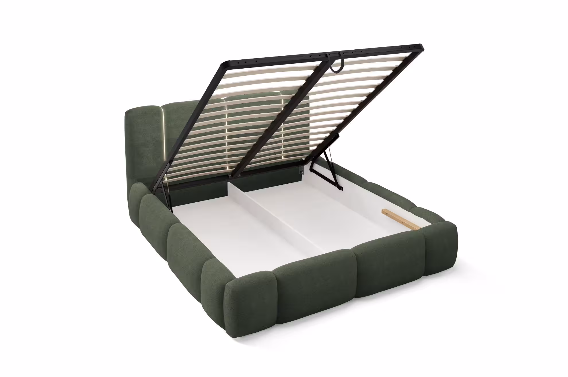 Model wyposażono w solidny metalowy stelaż z 34 listwami sprężynującymi, który zapewnia stabilne podparcie materaca. Siłowniki gazowe 1000N umożliwiają łatwe podnoszenie pojemnika na pościel, idealnego do przechowywania kołder, poduszek i innych tekstyliów.