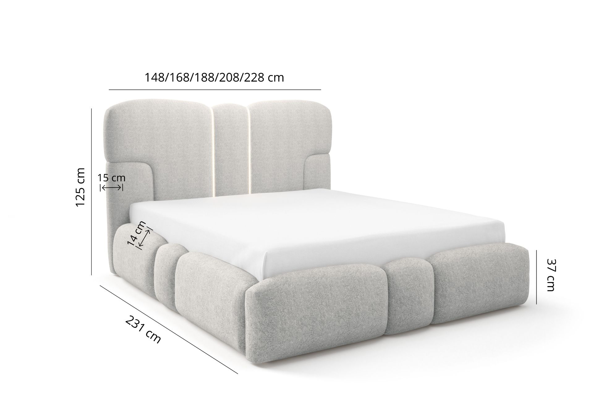 Łóżko nie posiada oświetlenia LED, co pozwala zachować minimalistyczny i estetyczny styl. To połączenie komfortu, funkcjonalności i elegancji, dzięki któremu sypialnia staje się miejscem przytulnym, spokojnym i harmonijnym.