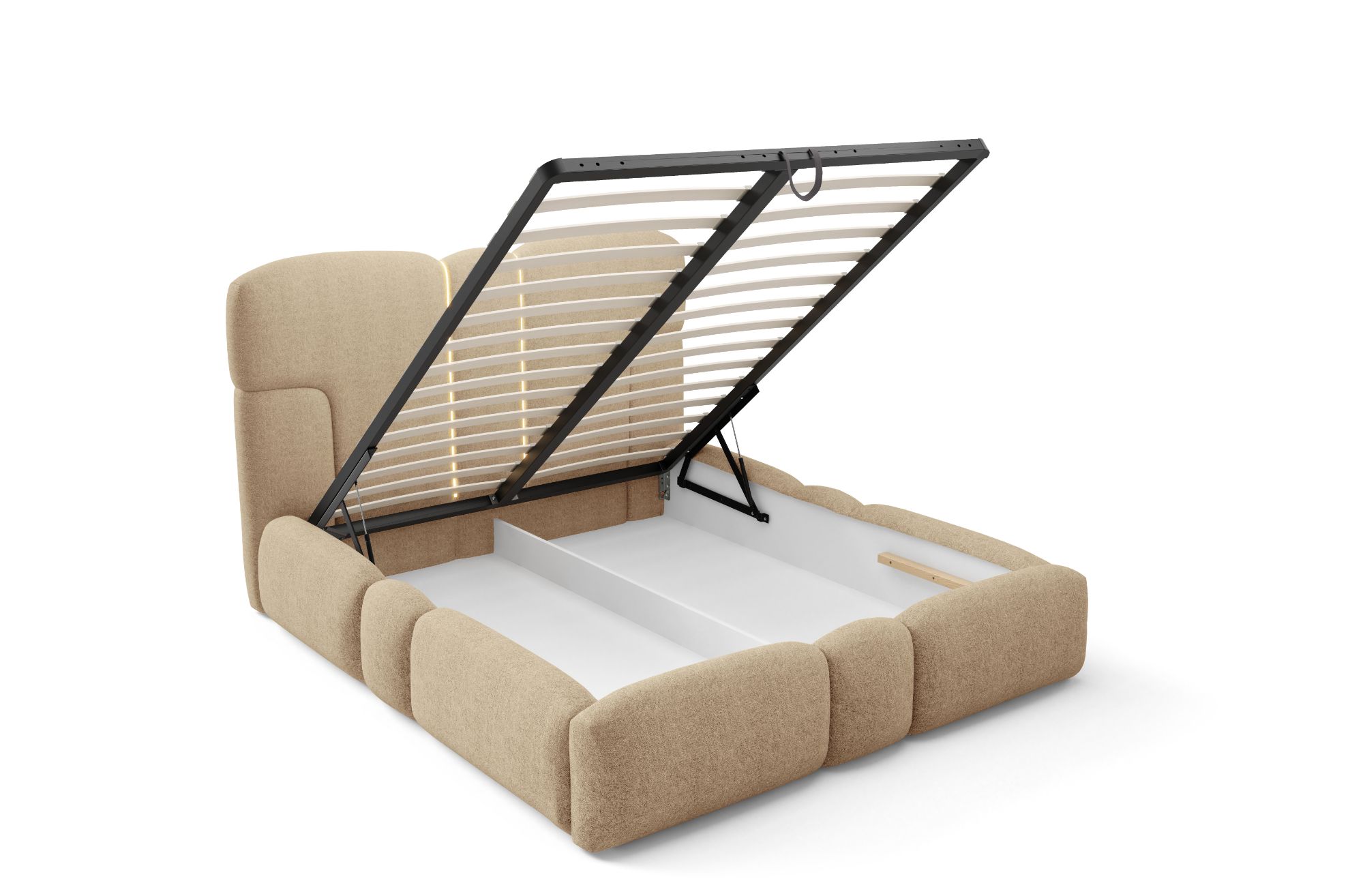 Łóżko nie posiada oświetlenia LED, co pozwala zachować minimalistyczny i estetyczny wygląd. To połączenie komfortu, funkcjonalności i elegancji, dzięki któremu sypialnia staje się miejscem przytulnym, spokojnym i harmonijnym.