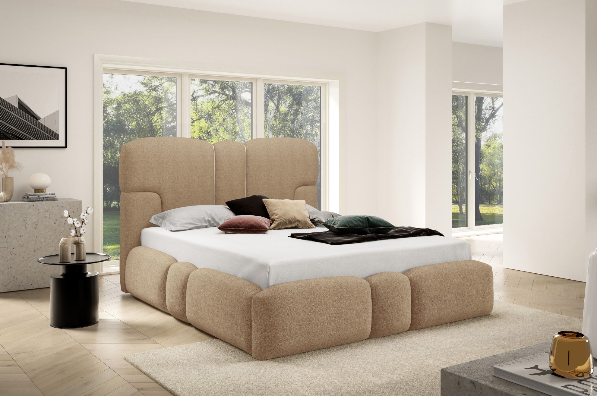 Łóżko tapicerowane Ophelio 200x200 w tkaninie DOHA 04 w jasnym beżowym kolorze to stylowa i komfortowa propozycja do sypialni. Miękka tapicerka Doha 04 w subtelnym jasnym beżowym odcieniu wprowadza do wnętrza ciepły, spokojny i harmonijny klimat, doskonale komponując się z nowoczesnymi oraz klasycznymi aranżacjami sypialni.