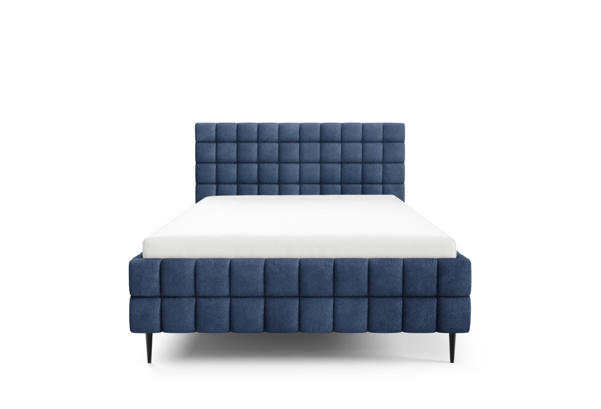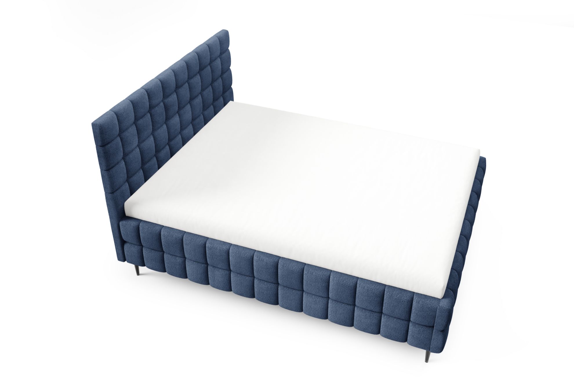 Łóżko posiada czarne metalowe nóżki w standardzie, które podkreślają jego nowoczesny charakter, a ozdobne przeszycia nadają całości elegancki i dopracowany wygląd. To połączenie komfortu, funkcjonalności i stylowego designu, dzięki któremu sypialnia staje się przytulnym i estetycznym miejscem wypoczynku.