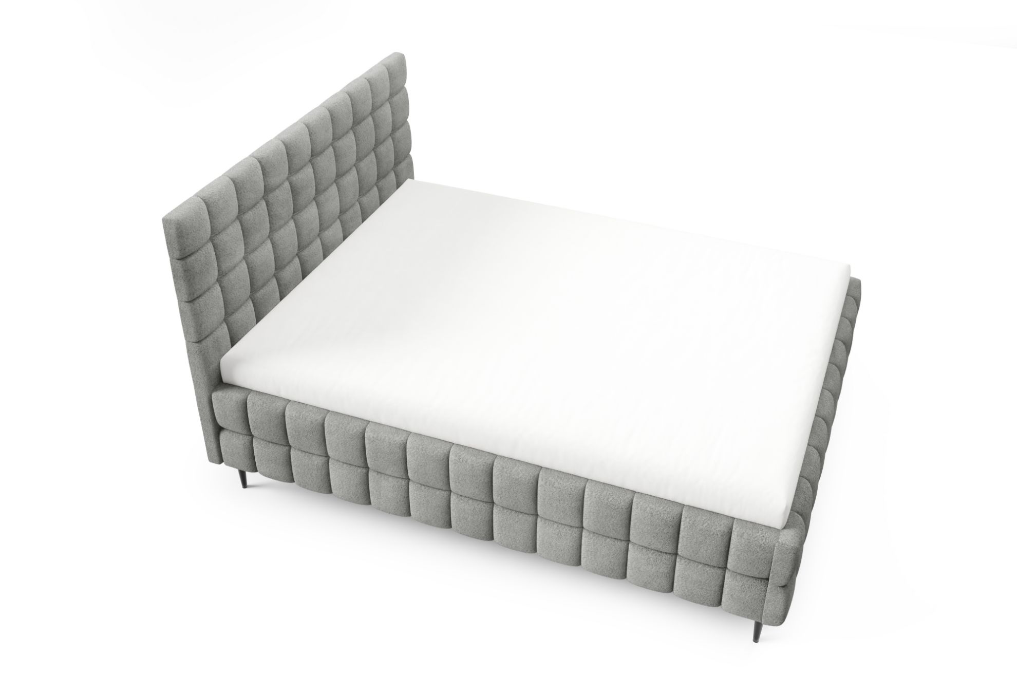 Łóżko posiada czarne metalowe nóżki w standardzie, które podkreślają jego nowoczesny charakter, a ozdobne przeszycia nadają całości elegancki i dopracowany wygląd. To harmonijne połączenie komfortu, funkcjonalności i stylowego designu, dzięki któremu sypialnia staje się przytulnym i estetycznym miejscem wypoczynku.