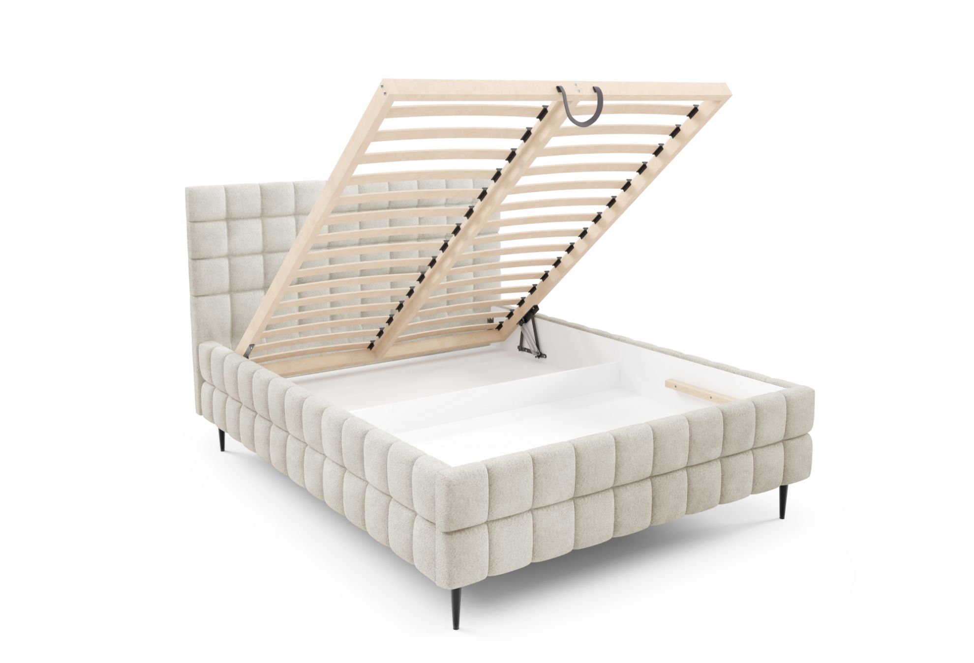 Model Dopio 140x200 został wyposażony w solidny drewniany stelaż z 32 listwami sprężynującymi oraz automatyczny mechanizm na sprężynach, który ułatwia otwieranie pojemnika na pościel, oferując praktyczną przestrzeń do przechowywania kołder, poduszek i innych tekstyliów.
