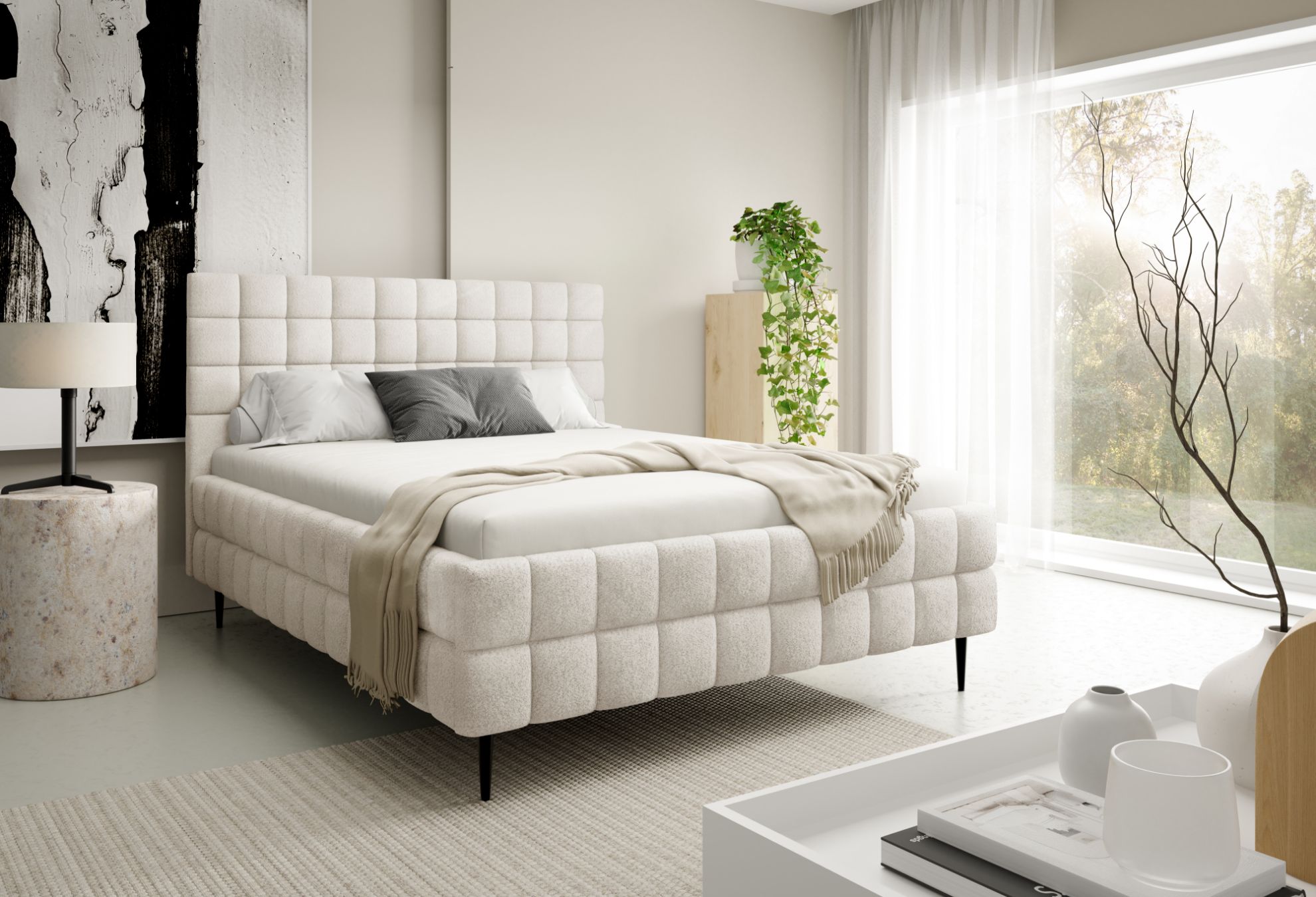 Łóżko posiada czarne metalowe nóżki w standardzie, które podkreślają jego nowoczesny charakter, a ozdobne przeszycia nadają całości elegancki i dopracowany wygląd. To połączenie komfortu, funkcjonalności i stylowego designu, dzięki któremu sypialnia staje się przytulnym i estetycznym miejscem wypoczynku.