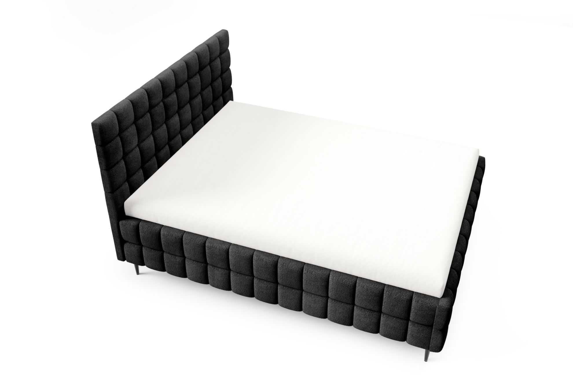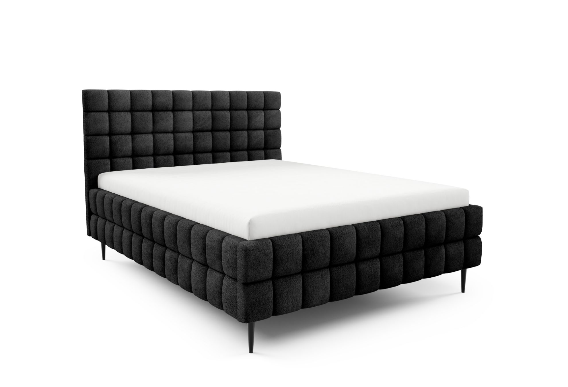 Łóżko posiada czarne metalowe nóżki w standardzie, które podkreślają jego nowoczesny charakter, a ozdobne przeszycia nadają całości elegancki i dopracowany wygląd. To harmonijne połączenie komfortu, funkcjonalności i stylowego designu, dzięki któremu sypialnia staje się przytulnym i estetycznym miejscem wypoczynku.