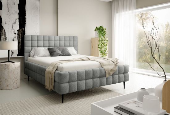 Łóżko posiada czarne metalowe nóżki w standardzie, które podkreślają jego nowoczesny design i nadają konstrukcji lekkości, a ozdobne przeszycia dodają całości elegancji oraz dopracowanego wykończenia. To harmonijne połączenie komfortu, funkcjonalności i stylowego wyglądu, dzięki któremu sypialnia staje się przytulnym i estetycznym miejscem wypoczynku.