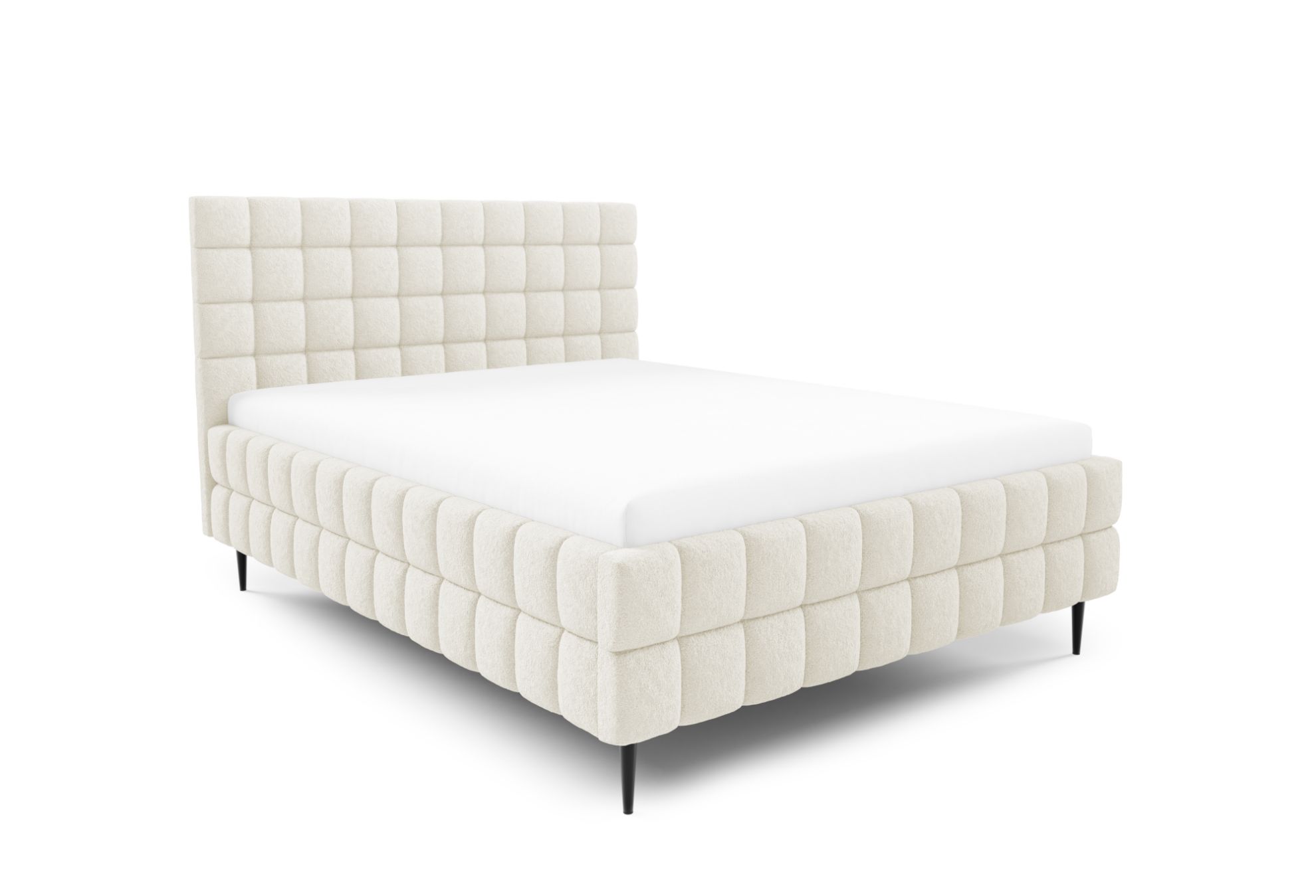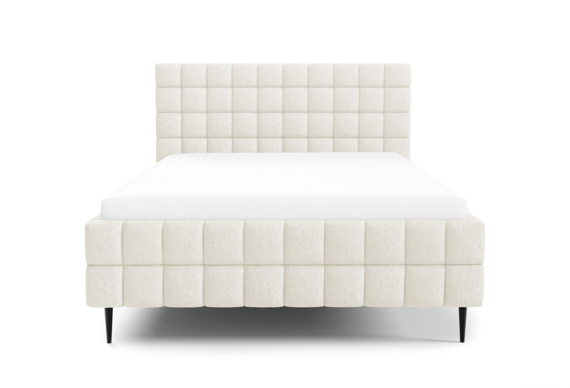 Łóżko posiada czarne metalowe nóżki w standardzie, które podkreślają jego nowoczesny design i nadają bryle lekkości, a ozdobne przeszycia dodają całości elegancji oraz starannego wykończenia. To harmonijne połączenie komfortu, funkcjonalności i stylowego wyglądu, dzięki któremu sypialnia staje się estetycznym i wygodnym miejscem codziennego wypoczynku.