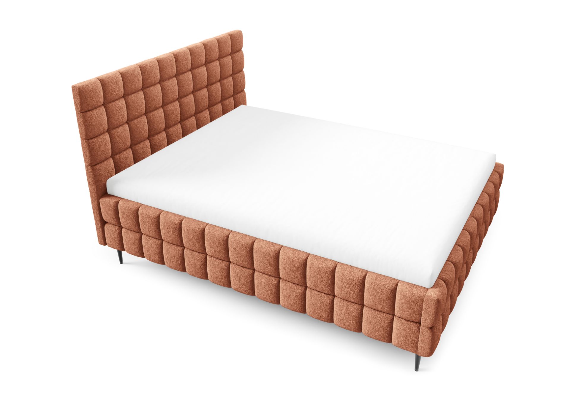 Łóżko posiada czarne metalowe nóżki w standardzie, które podkreślają jego nowoczesny design, a ozdobne przeszycia nadają całości elegancki i dopracowany wygląd. To harmonijne połączenie komfortu, funkcjonalności i stylowego designu, dzięki któremu sypialnia staje się przytulnym i estetycznym miejscem wypoczynku.