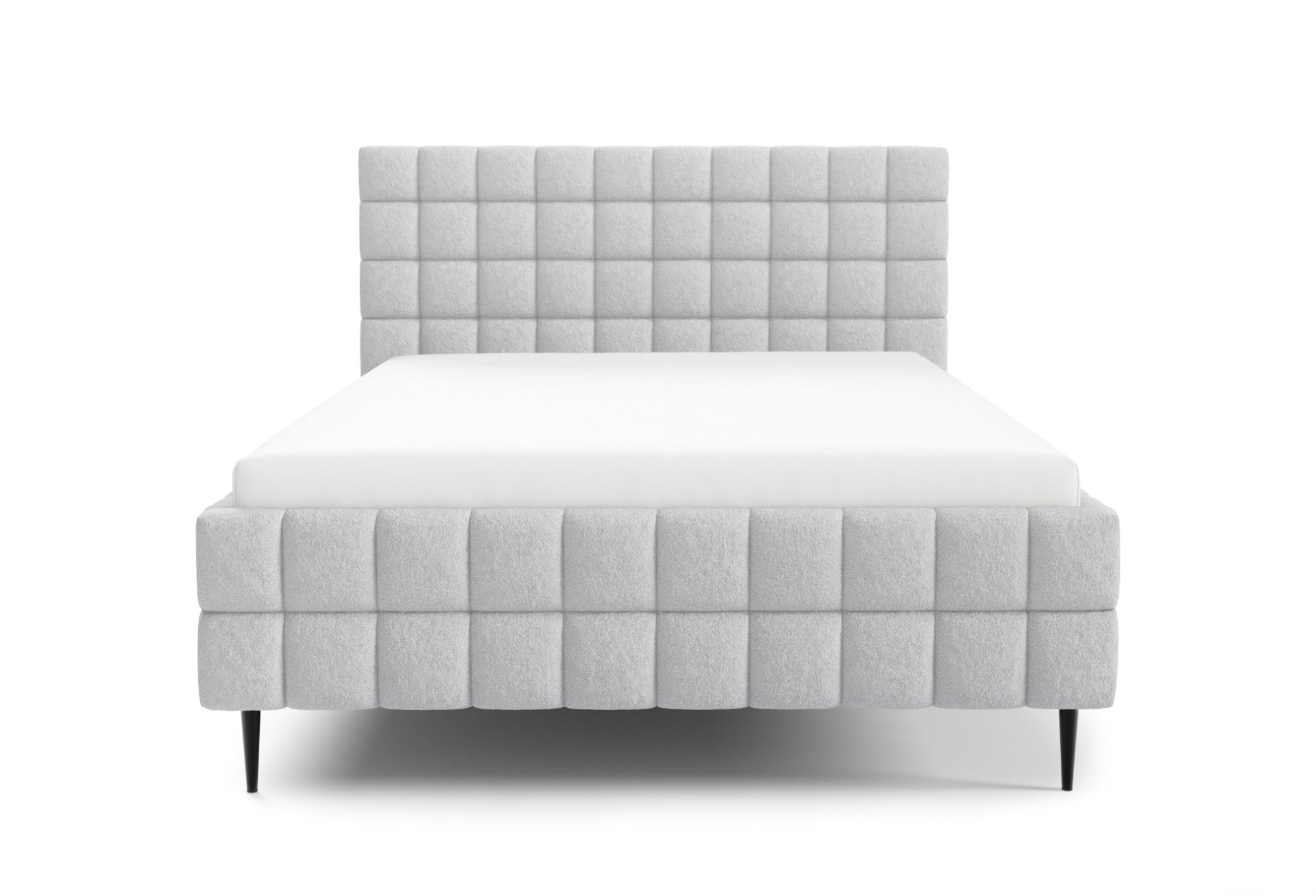 Łóżko posiada czarne metalowe nóżki w standardzie, które podkreślają jego nowoczesny charakter, a ozdobne przeszycia nadają całości elegancki i dopracowany wygląd. To połączenie komfortu, funkcjonalności i stylowego designu, dzięki któremu sypialnia staje się przytulnym i estetycznym miejscem wypoczynku.