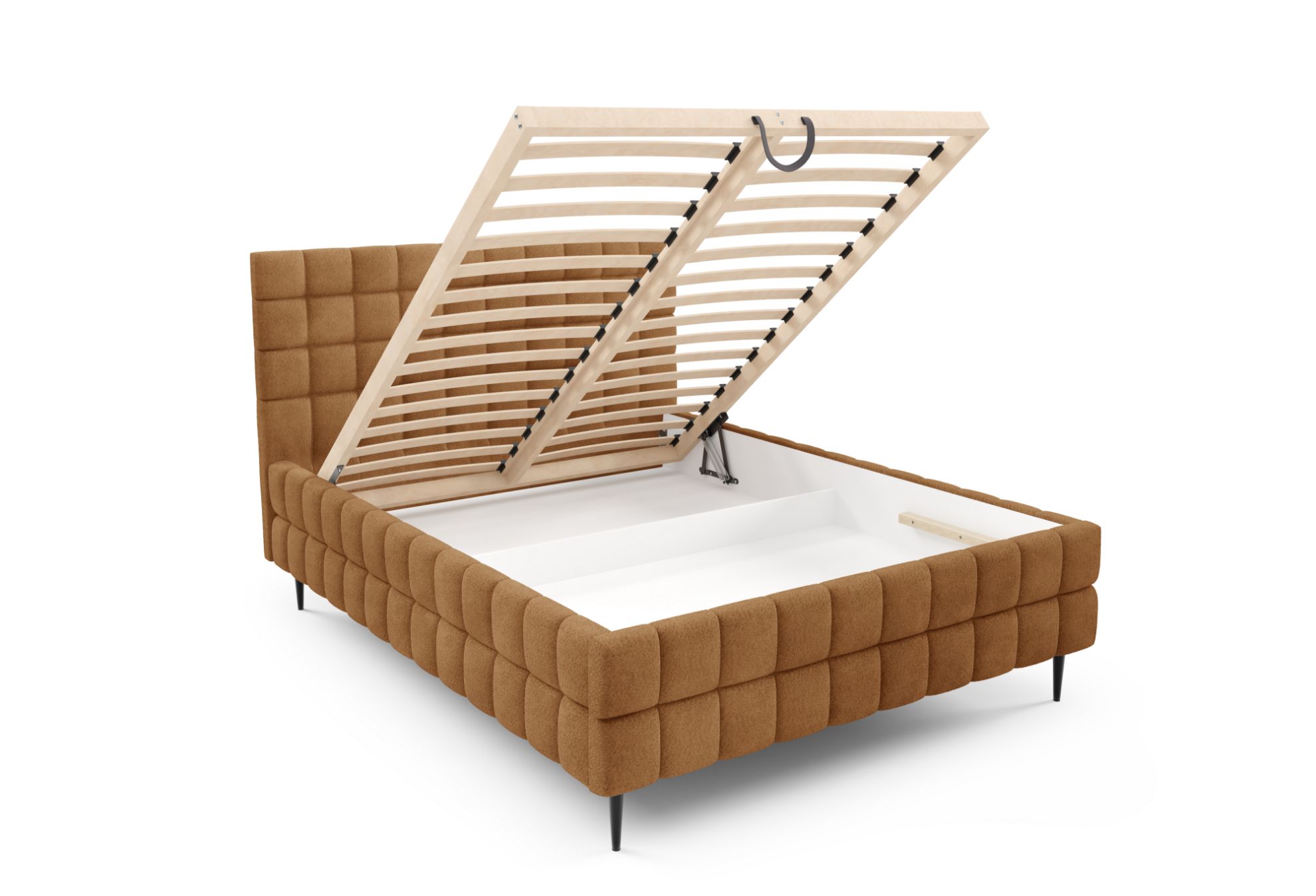 Model Dopio 160x200 został wyposażony w solidny drewniany stelaż z 32 listwami sprężynującymi oraz automatyczny mechanizm na sprężynach, który ułatwia otwieranie pojemnika na pościel, oferując praktyczną przestrzeń do przechowywania kołder, poduszek i innych tekstyliów.