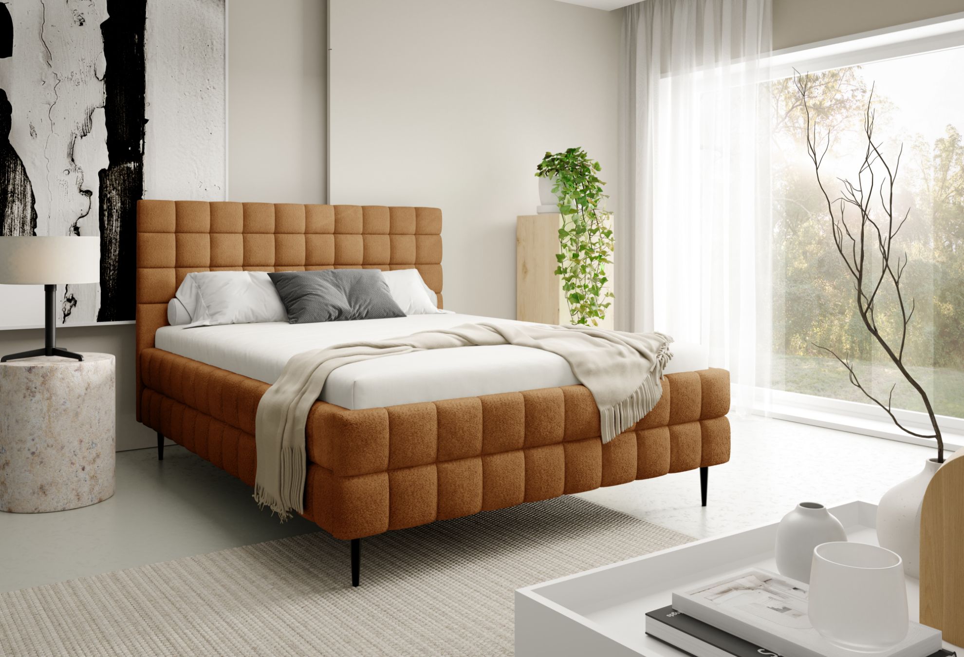 Łóżko posiada czarne metalowe nóżki w standardzie, które podkreślają jego nowoczesny charakter, a ozdobne przeszycia nadają całości elegancki i dopracowany wygląd. To połączenie komfortu, funkcjonalności i stylowego designu, dzięki któremu sypialnia staje się przytulnym i estetycznym miejscem wypoczynku.