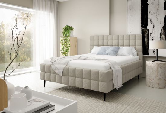 Łóżko posiada czarne metalowe nóżki w standardzie, które podkreślają jego nowoczesny charakter i nadają konstrukcji lekkości, a ozdobne przeszycia dodają całości elegancji oraz dopracowanego wykończenia. To idealne połączenie komfortu, funkcjonalności i stylowego designu, dzięki któremu sypialnia staje się przytulnym i estetycznym miejscem codziennego wypoczynku.