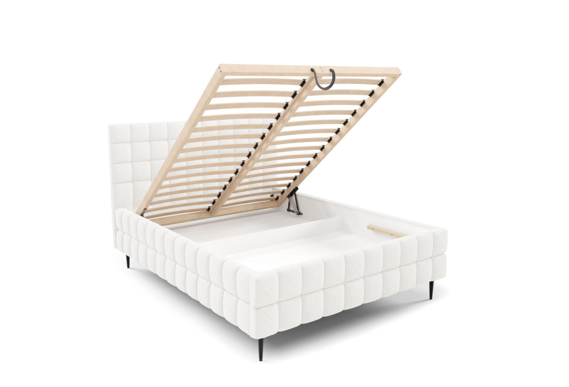 Model Dopio 180x200 został wyposażony w solidny drewniany stelaż z 32 listwami sprężynującymi oraz automatyczny mechanizm na sprężynach, który ułatwia wygodne otwieranie pojemnika na pościel, zapewniając praktyczną przestrzeń do przechowywania kołder, poduszek i innych tekstyliów.