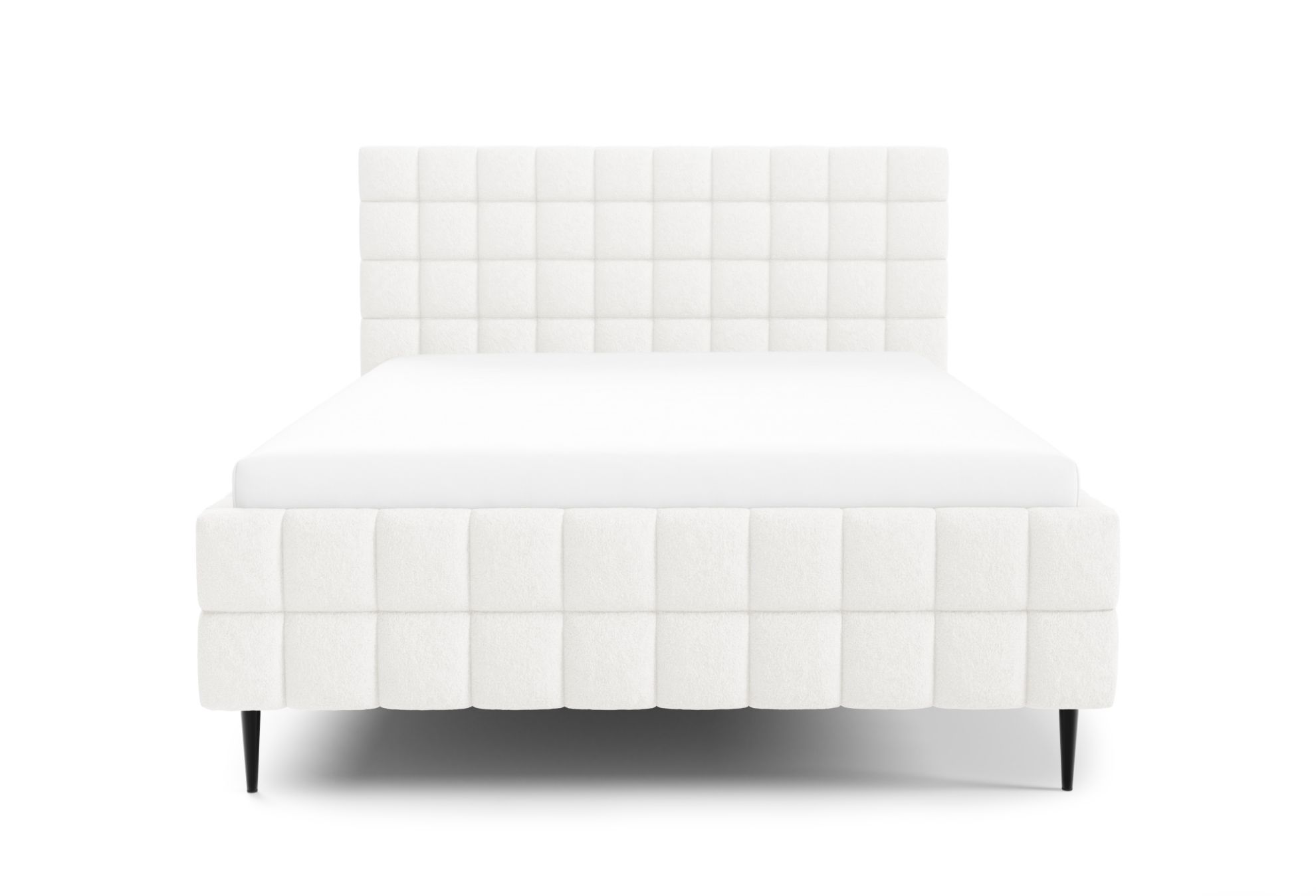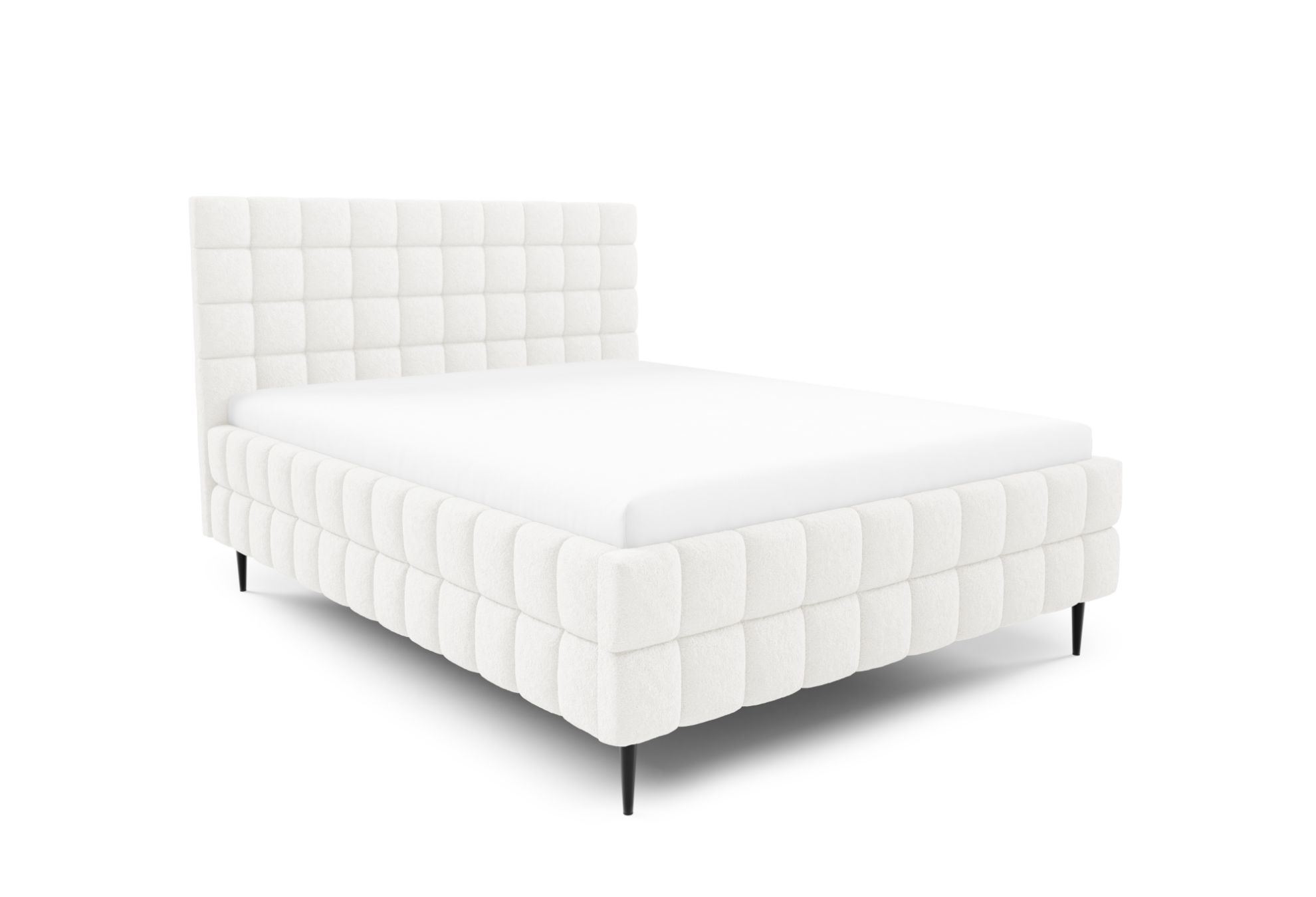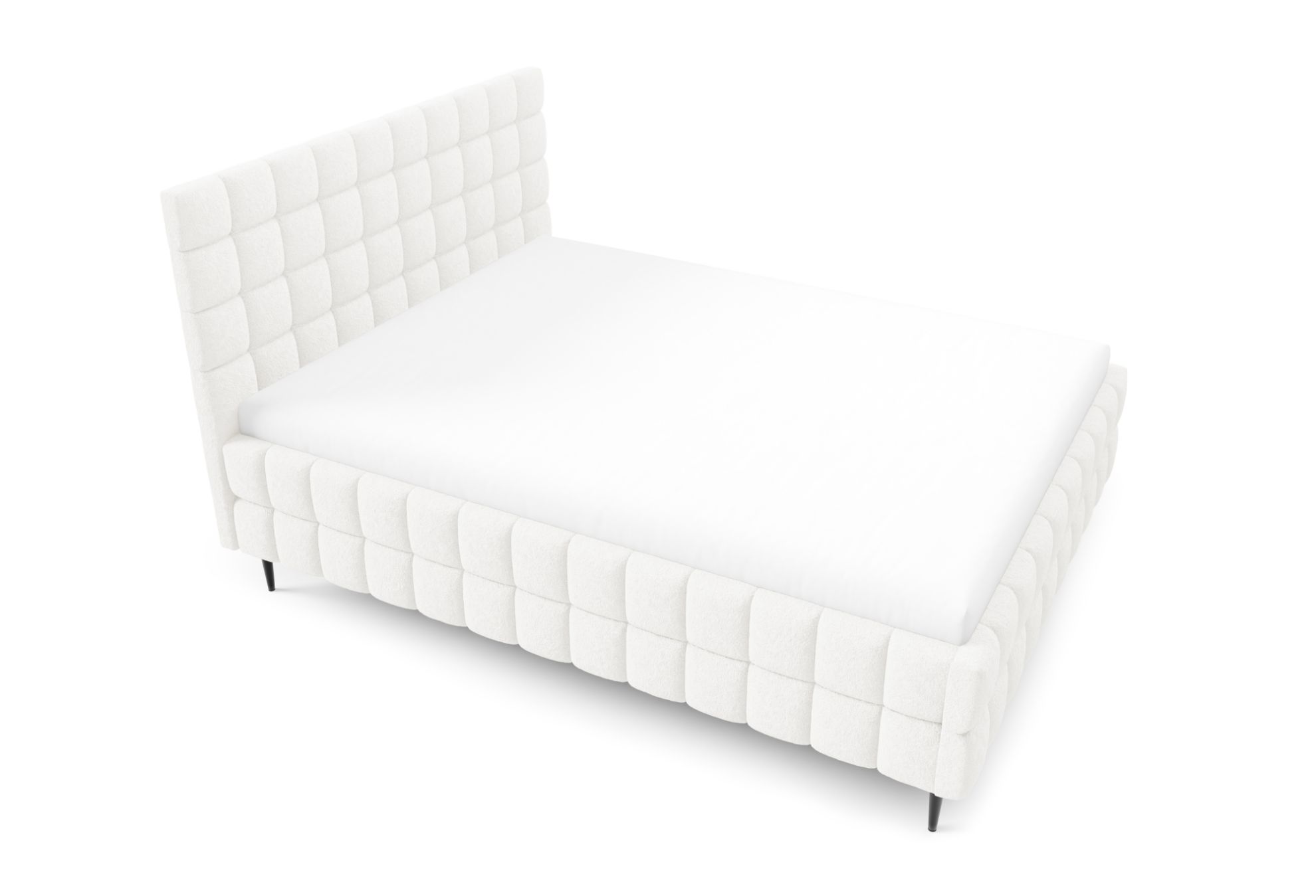 Łóżko posiada czarne metalowe nóżki w standardzie, które podkreślają jego nowoczesny design i nadają bryle lekkości, a ozdobne przeszycia dodają całości elegancji oraz starannego wykończenia. To harmonijne połączenie komfortu, funkcjonalności i stylowego wyglądu, dzięki któremu sypialnia staje się estetycznym i wygodnym miejscem codziennego wypoczynku.
