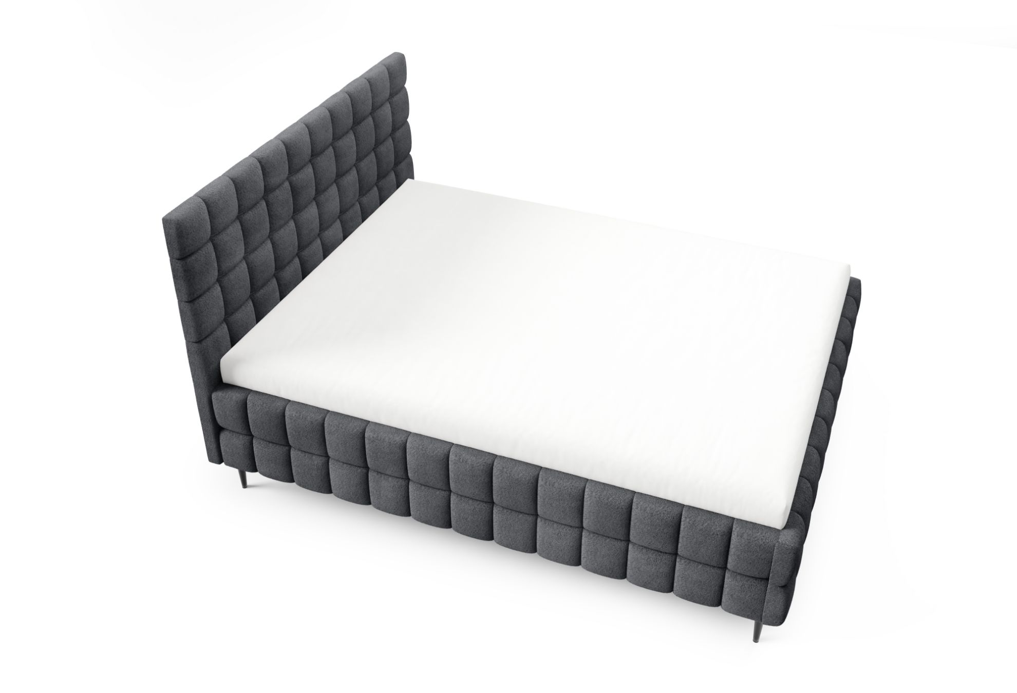 Łóżko posiada czarne metalowe nóżki w standardzie, które podkreślają jego nowoczesny design i nadają konstrukcji lekkości, a ozdobne przeszycia dodają całości elegancji oraz dopracowanego wykończenia. To harmonijne połączenie komfortu, funkcjonalności i stylowego wyglądu, dzięki któremu sypialnia staje się przytulnym i estetycznym miejscem codziennego wypoczynku.