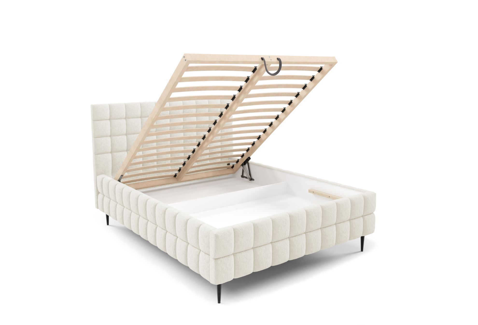 Model Dopio 180x200 został wyposażony w solidny drewniany stelaż z 32 listwami sprężynującymi oraz automatyczny mechanizm na sprężynach, który ułatwia wygodne otwieranie pojemnika na pościel, zapewniając praktyczną przestrzeń do przechowywania kołder, poduszek i innych tekstyliów.