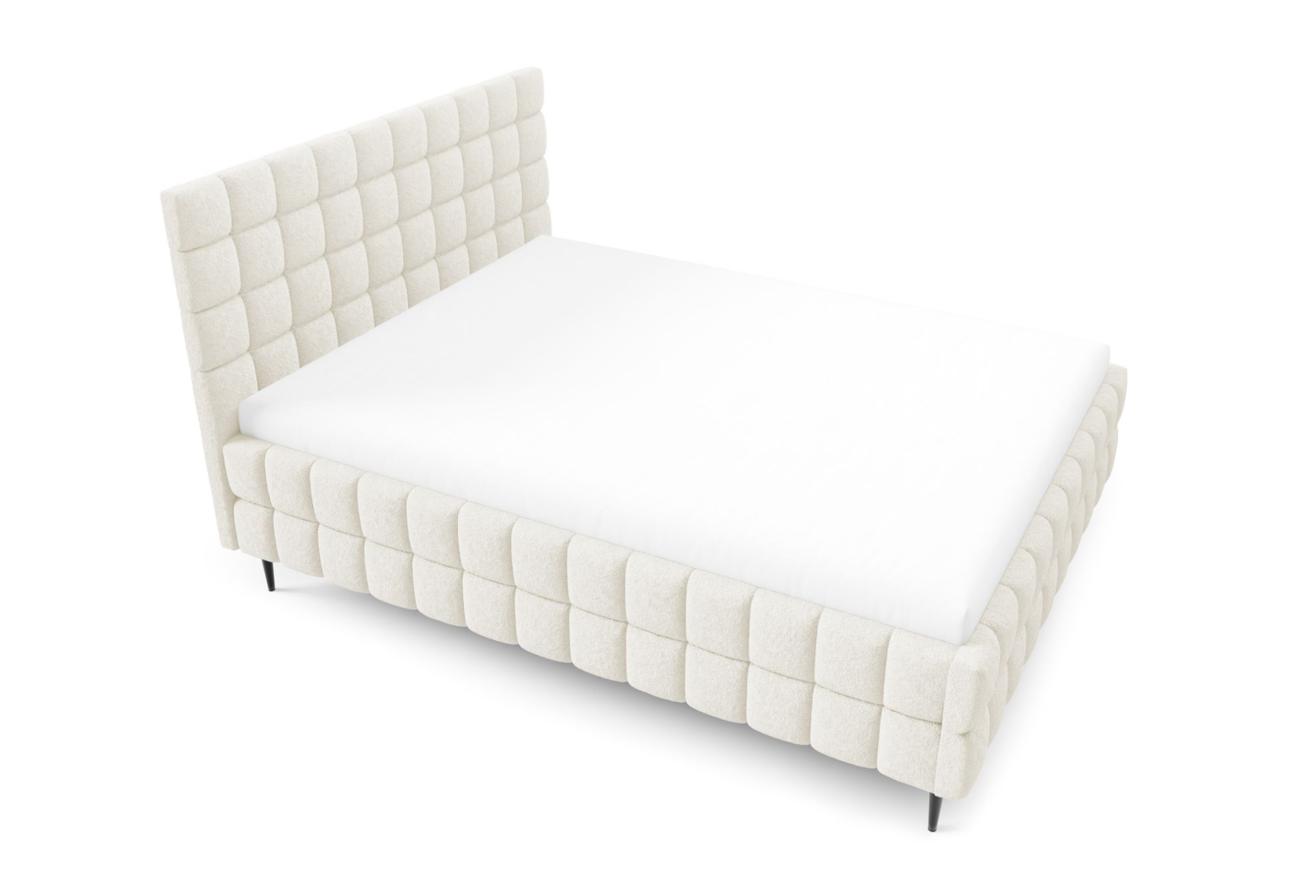 Łóżko posiada czarne metalowe nóżki w standardzie, które podkreślają jego nowoczesny design i nadają bryle lekkości, a ozdobne przeszycia dodają całości elegancji oraz starannego wykończenia. To harmonijne połączenie komfortu, funkcjonalności i stylowego wyglądu, dzięki któremu sypialnia staje się estetycznym i wygodnym miejscem codziennego wypoczynku.