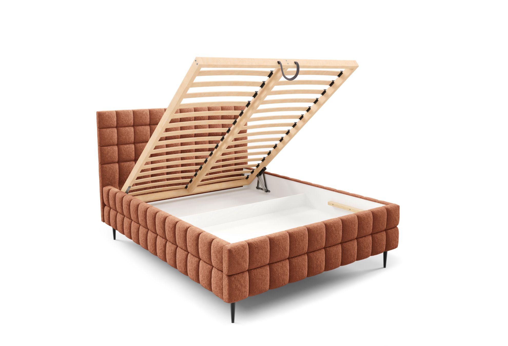 Model Dopio 180x200 został wyposażony w solidny drewniany stelaż z 32 listwami sprężynującymi oraz automatyczny mechanizm na sprężynach, który ułatwia wygodne otwieranie pojemnika na pościel, oferując funkcjonalną przestrzeń do przechowywania kołder, poduszek i innych tekstyliów.