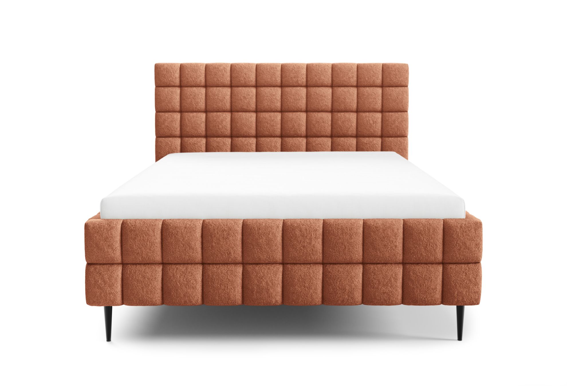 Łóżko posiada czarne metalowe nóżki w standardzie, które podkreślają jego nowoczesny design, a ozdobne przeszycia nadają całości elegancki i dopracowany wygląd. To harmonijne połączenie komfortu, funkcjonalności i stylowego designu, dzięki któremu sypialnia staje się przytulnym i estetycznym miejscem wypoczynku.