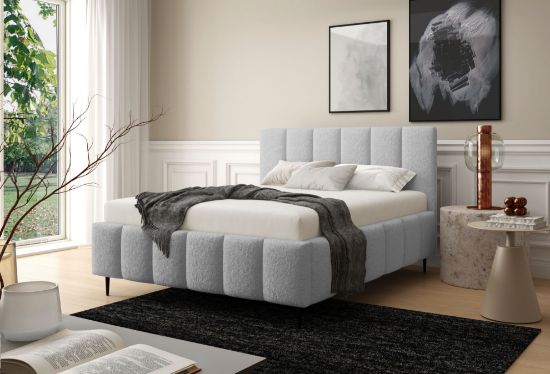 Łóżko tapicerowane z nogami Krima 140x200 w tkaninie Lambi 11 w popielatym kolorze to nowoczesna i elegancka propozycja do sypialni. Tapicerka Lambi 11 w subtelnym popielatym odcieniu wprowadza do wnętrza harmonię, spokój i stylowy charakter, doskonale komponując się zarówno z jasnymi, jak i kontrastowymi aranżacjami.