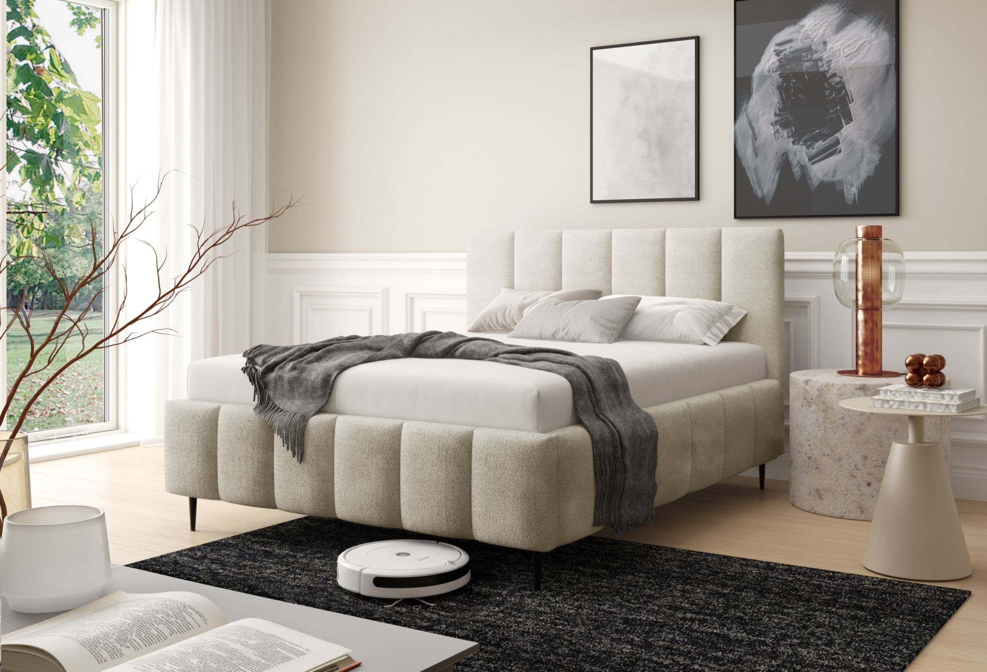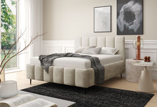 Łóżko tapicerowane z nogami Krima 160x200 w tkaninie Coral 15 w kremowym kolorze to elegancka i nowoczesna propozycja do sypialni. Tapicerka Coral 15 w delikatnym kremowym odcieniu wprowadza do wnętrza lekkość, harmonię i subtelną elegancję, doskonale komponując się zarówno z jasnymi, jak i kontrastowymi aranżacjami.