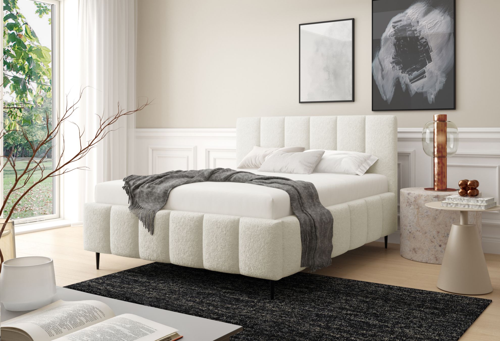 Łóżko tapicerowane z nogami Krima 160x200 w tkaninie Lambi 01 w kremowym kolorze to elegancka i ponadczasowa propozycja do sypialni. Tapicerka Lambi 01 w delikatnym kremowym odcieniu wprowadza do wnętrza lekkość, ciepło i harmonijny charakter, doskonale komponując się zarówno z jasnymi, jak i kontrastowymi aranżacjami.