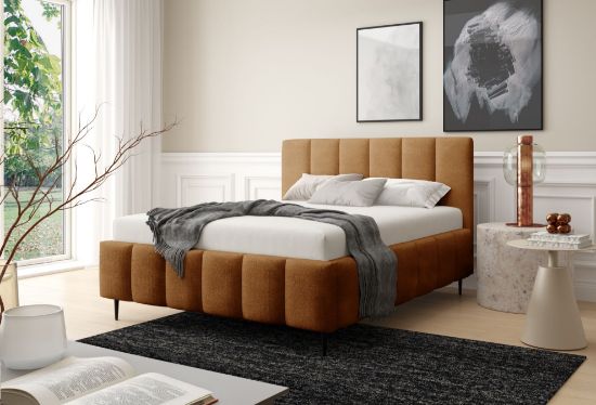 Łóżko tapicerowane z nogami Krima 160x200 w tkaninie Coral 35 w rudym kolorze to wyrazista i nowoczesna propozycja do sypialni. Tapicerka Coral 35 w intensywnym rudym odcieniu wprowadza do wnętrza ciepło, energię i unikalny charakter, doskonale komponując się zarówno z neutralnymi, jak i kontrastowymi aranżacjami.