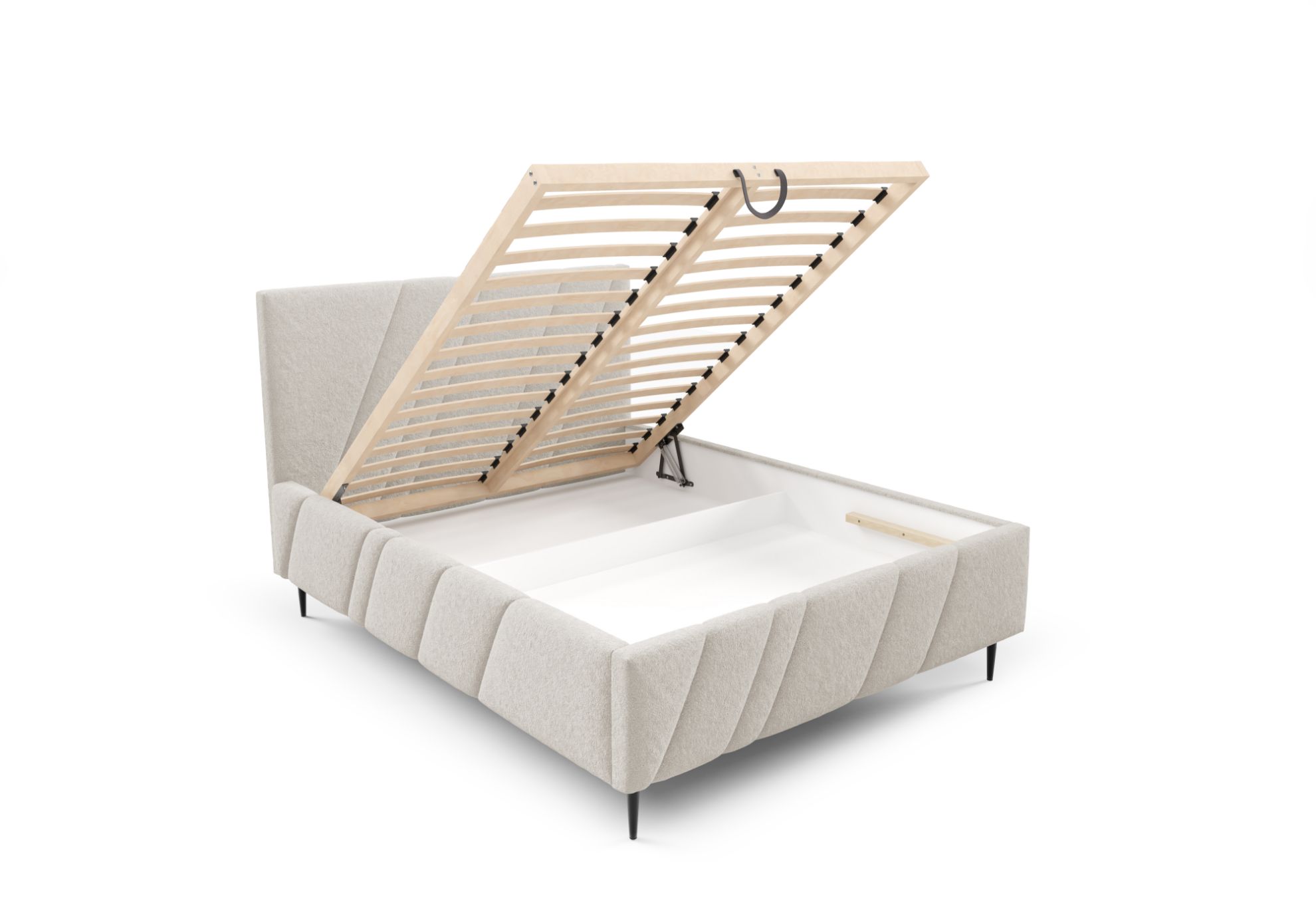 Model Kseno 160x200 został wyposażony w solidny drewniany stelaż w standardzie 32 z listwami sprężynującymi oraz automat na sprężynach ułatwiający otwieranie pojemnika, co zapewnia stabilne podparcie materaca oraz praktyczne wykorzystanie przestrzeni do przechowywania.
