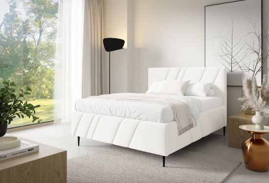 Czarne metalowe nóżki nadają łóżku stabilność oraz nowoczesny charakter, a ozdobne przeszycia w tapicerce podkreślają dopasowany i elegancki design mebla. To połączenie wygody, funkcjonalności i stylu, dzięki któremu sypialnia staje się przytulnym i komfortowym miejscem codziennego odpoczynku.