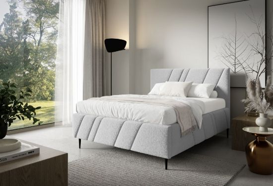Czarne metalowe nóżki nadają łóżku stabilność oraz nowoczesny charakter, a ozdobne przeszycia w tapicerce podkreślają dopasowany i elegancki design mebla. To połączenie wygody, funkcjonalności i stylu, dzięki któremu sypialnia staje się przytulnym i komfortowym miejscem codziennego odpoczynku.