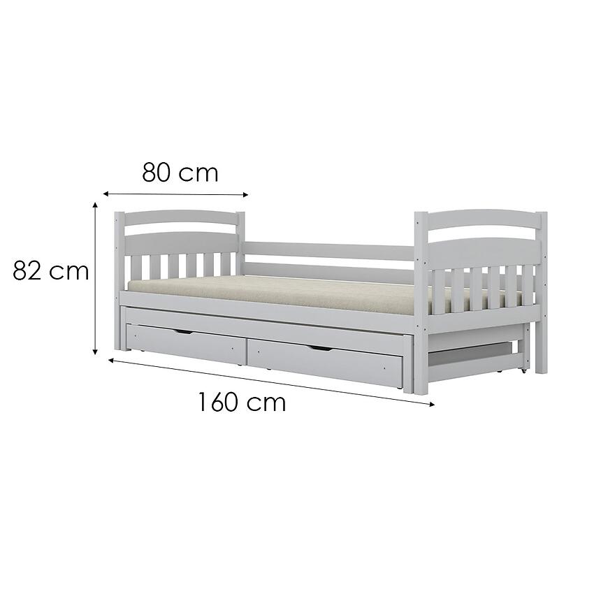 Konstrukcja wykonana z drewna zapewnia trwałość i stabilność podczas codziennego użytkowania. Wymiary łóżka to 160 cm szerokości, 80 cm głębokości oraz 82 cm wysokości, co gwarantuje wygodną powierzchnię spania 160x80 cm. W zestawie znajduje się stelaż 160x80, dzięki czemu łóżko jest gotowe do uzupełnienia o odpowiedni materac (materac nie jest dołączony do kompletu).